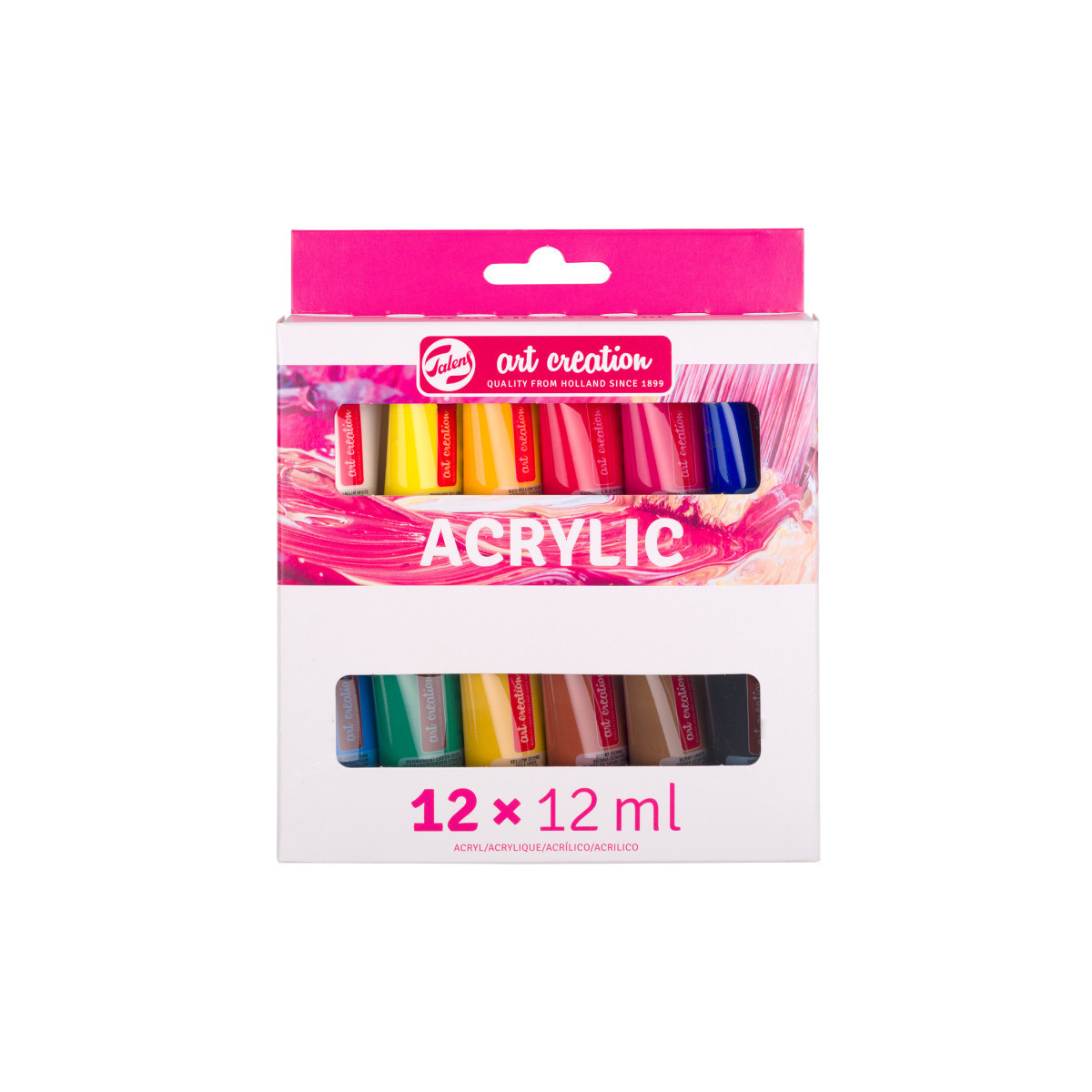 This acrylic color set of 12 x 12 ml tubes offers a great basic palette of colors to create various paintings with. Because of their convenient size, these tubes are ideal to have in your studio or to take with you while you travel. Contents: 12 x 12 ml tubes (105 Titanium White – 227 Yellow Ochre – 270 Azo Yellow Deep – 275 Primary Yellow – 369 Primary Magenta – 396 Naphthol Red Medium – 409 Burnt Umber – 411 Burnt Sienna – 504 – Ultramarine – 572 Primary Cyan – 619 Permanent Green Deep – 701 Ivory Black). Talens Art Creation acrylic color is a reliable quality acrylic paint based on acrylic resin. The paint has a pasty consistency, dries quickly and has a silky gloss when dry. These acrylic colors can be used both straight from the tube and thinned with water and are waterproof when dry. The colors are easy to mix with one another and easy to use due to their dosing cap. This versatile paint can be used on almost any surface, as long as it is somewhat absorbent and free of grease and dust. From canvas and paper to plaster, board, wood, stone and cement. Since the tubes are transparent, you can easily pick the color you want to use while painting.