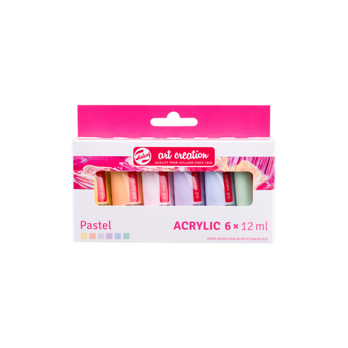 This acrylic color set of 6 x 12 ml tubes offers a great palette of summery colors to create various paintings with. Because of their convenient size, these tubes are ideal to have in your studio or to take with you while you travel. Contents: 6 x 12 ml tubes (226 Pastel Yellow - 224 Naples Yellow Red – 390 Pastel Rose – 584 Pastel Lilac – 580 Pastel Blue – 666 Pastel Green). Talens Art Creation acrylic color is a reliable quality acrylic paint based on acrylic resin. The paint has a pasty consistency, dries quickly and has a silky gloss when dry. These acrylic colors can be used both straight from the tube and thinned with water and are waterproof when dry. The colors are easy to mix with one another and easy to use due to their dosing cap.