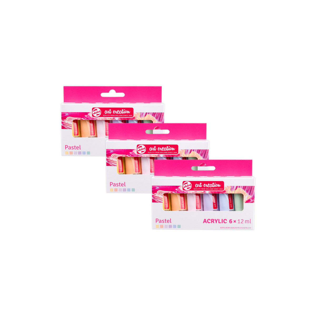 This acrylic color set offers a great palette of summery colors to create various paintings with. Because of their convenient size, these tubes are ideal to have in your studio or to take with you while you travel. Each set includes 6 x 12 ml tubes (226 Pastel Yellow - 224 Naples Yellow Red – 390 Pastel Rose – 584 Pastel Lilac – 580 Pastel Blue – 666 Pastel Green). Talens Art Creation acrylic color is a reliable quality acrylic paint based on acrylic resin. The paint has a pasty consistency, dries quickly and has a silky gloss when dry. These acrylic colors can be used both straight from the tube and thinned with water and are waterproof when dry. The colors are easy to mix with one another and easy to use due to their dosing cap. Sold as 3 sets for a total of 18 tubes.
