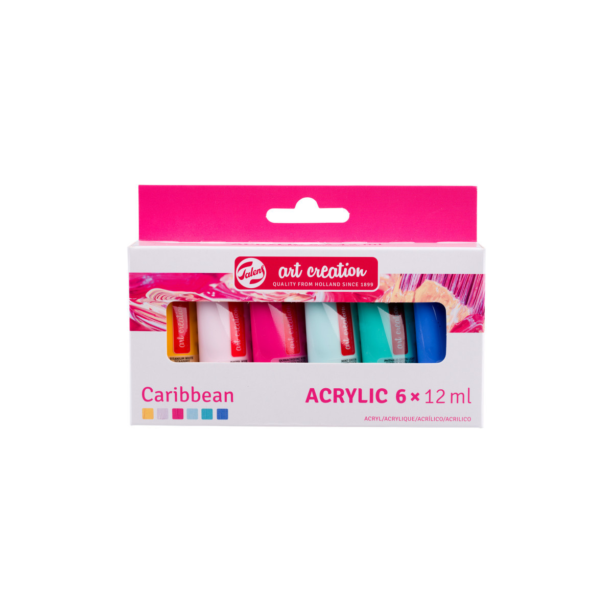 This acrylic color set of 6 x 12 ml tubes offers a great palette of summery colors to create various paintings with. Because of their convenient size, these tubes are ideal to have in your studio or to take with you while you travel. Contents: 6 x 12 ml tubes (269 Azo Yellow Medium – 390 Pastel Rose – 366 Quinacridone Rose – 517 King’s Blue – 678 Mint Green – 673 Phthalo Green Light). Talens Art Creation acrylic color is a reliable quality acrylic paint based on acrylic resin. The paint has a pasty consistency, dries quickly and has a silky gloss when dry. These acrylic colors can be used both straight from the tube and thinned with water and are waterproof when dry. The colors are easy to mix with one another and easy to use due to their dosing cap.