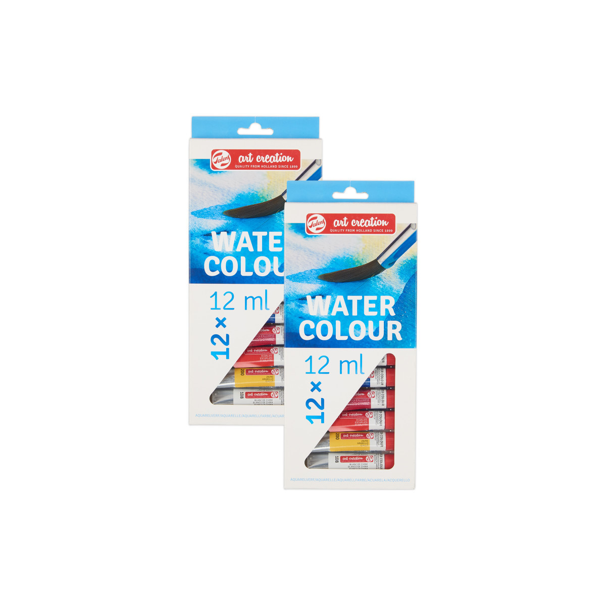 This watercolor set offers a great basic palette of colors to create various paintings with. Because of their convenient size, these tubes are ideal to have in your studio or to take with you while you travel. Each set includes 12 x 12 ml tubes (108 Chinese White – 200 Yellow – 334 Scarlet – 326 Alizarin Crimson – 504 Ultramarine – 535 Cerulean Blue (Phthalo) – 617 Yellowish Green – 602 Deep Green – 227 Yellow Ochre – 411 Burnt Sienna – 409 Burnt Umber – 708 Payne’s Grey). Talens Art Creation watercolor is a transparent paint that is applied thinned with water. The more water you use, the lighter the color of the paint becomes. As a result, you can work with many transparent layers on top of one another to create beautiful color effects. Watercolors are not waterproof when dry, so you can rework the paint using water if necessary. Use these colors on dry paper to create sharp details and wet your paper to let the colors flow gently and create seamless color transitions. Sold as 2 sets for a total of 24 tubes.