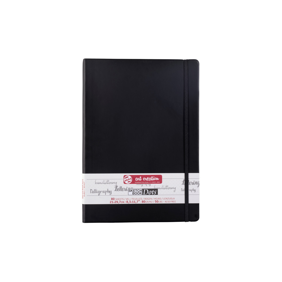 The dotted sheets of these sketchbooks are a wonderful compromise between blank and ruled or gridded sheets; they offer you a guide without taking attention away from what you create. With these evenly spaced dots, you can experience the insurance of lines and the freedom of a blank page in one sketchbook! Use these books for anything you want: taking notes, planning, drawing diagrams, mind maps, sketching, bullet journaling, lettering, calligraphy, you name it! They are suitable for pencil and ink and come in a variety of sizes. Talens Art Creation dotted sketchbooks contain 80 cream-colored, dotted sheets of 80 g/m², feature a soft, stylish black cover and include a ribbon bookmark and elastic closure band.