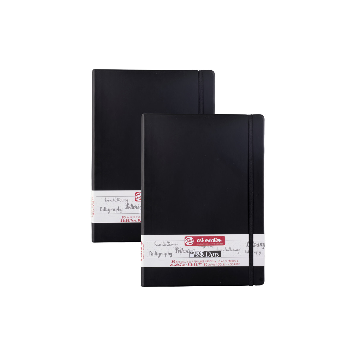 The dotted sheets of these sketchbooks are a wonderful compromise between blank and ruled or gridded sheets; they offer you a guide without taking attention away from what you create. With these evenly spaced dots, you can experience the insurance of lines and the freedom of a blank page in one sketchbook! Use these books for anything you want: taking notes, planning, drawing diagrams, mind maps, sketching, bullet journaling, lettering, calligraphy, you name it! They are suitable for pencil and ink and come in a variety of sizes. Talens Art Creation dotted sketchbooks contain 80 cream-colored, dotted sheets of 80 g/m², feature a soft, stylish black cover and include a ribbon bookmark and elastic closure band. Sold as a pack of 2.