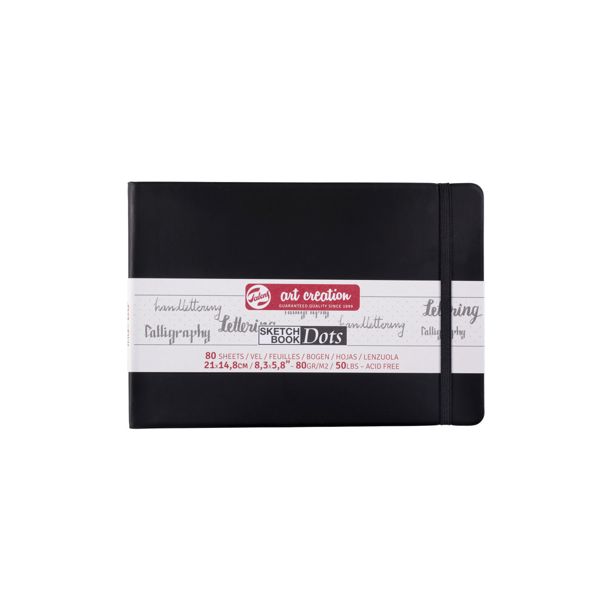 The dotted sheets of these sketchbooks are a wonderful compromise between blank and ruled or gridded sheets; they offer you a guide without taking attention away from what you create. With these evenly spaced dots, you can experience the insurance of lines and the freedom of a blank page in one sketchbook! Use these books for anything you want: taking notes, planning, drawing diagrams, mind maps, sketching, bullet journaling, lettering, calligraphy, you name it! They are suitable for pencil and ink and come in a variety of sizes. Talens Art Creation dotted sketchbooks contain 80 cream-colored, dotted sheets of 80 g/m², feature a soft, stylish black cover and include a ribbon bookmark and elastic closure band.
