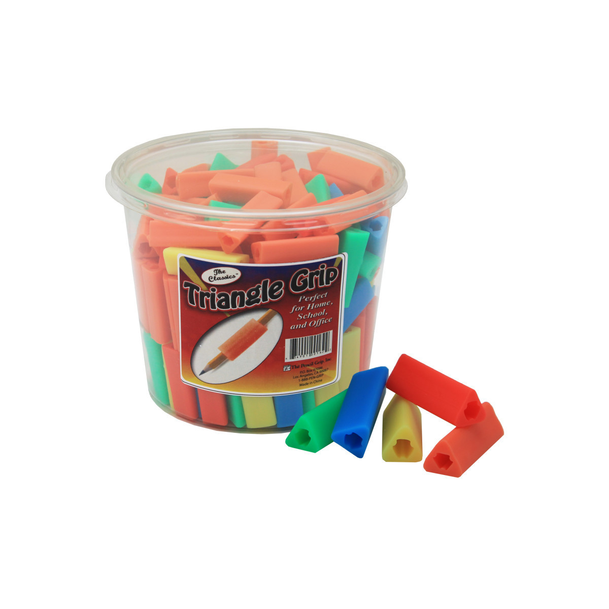 These Triangle Grips are a part of The Classics collection. This traditional three sided design is one of the oldest and most well known grip styles. These items are high quality comfortable grips at an affordable price. They are available in a vibrant assortment of translucent colors including: Blue, Green, Pink, Orange, and Yellow. Each pack contains 200 grips in a plastic bucket.