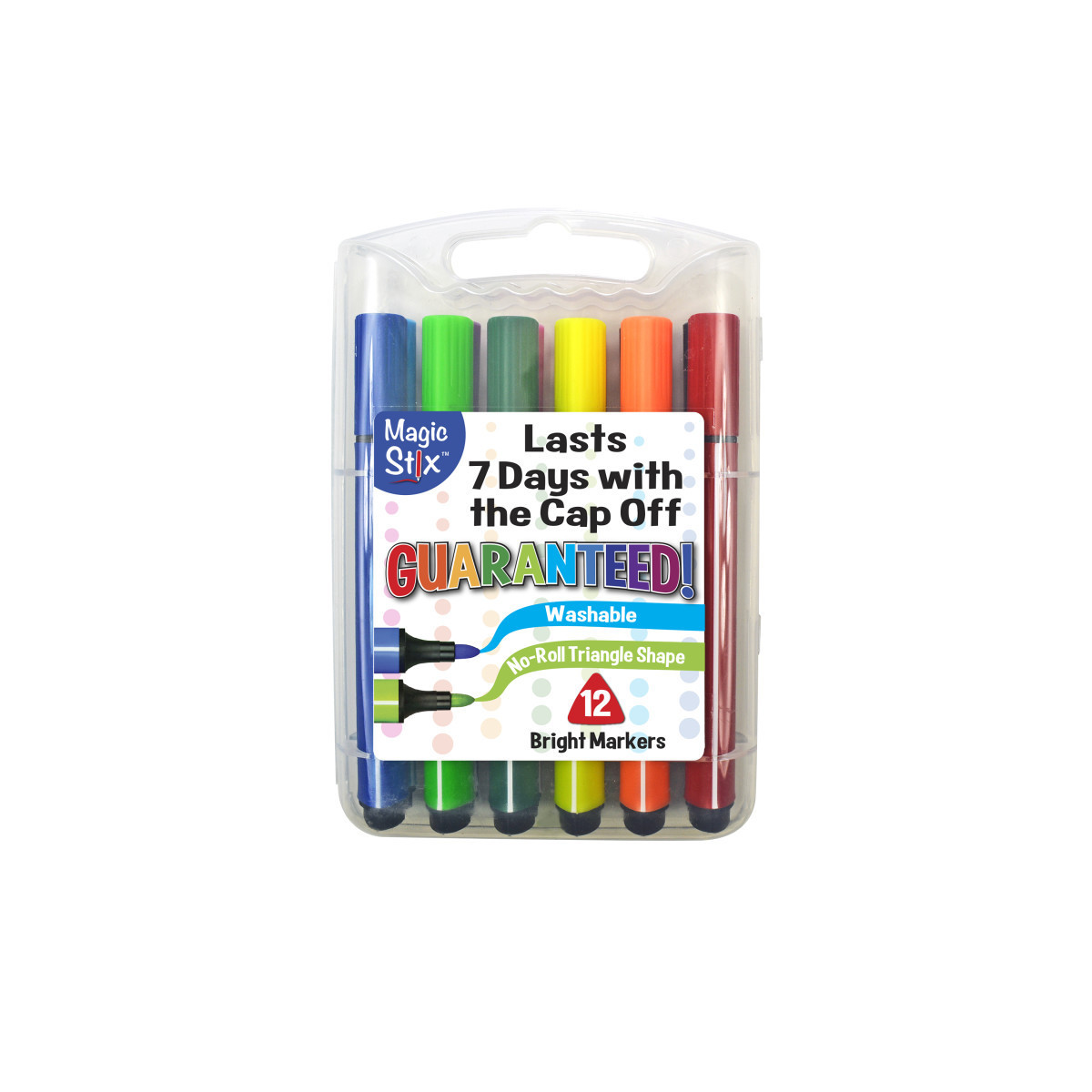 Magic Stix are GUARANTEED to bring long lasting color to the page with the cap off for up to 7 DAYS without drying out! They have a new, triangular shape to promote proper grip and help develop fine motor skills. Added bonus of the triangular shape- Magic Stix will not roll off your table or desk while working! With 12 classic colors, these washable and non-toxic markers will remain fresh use after use, project after project. Magic Stix are non-toxic and washable. Each pack includes 12 markers.