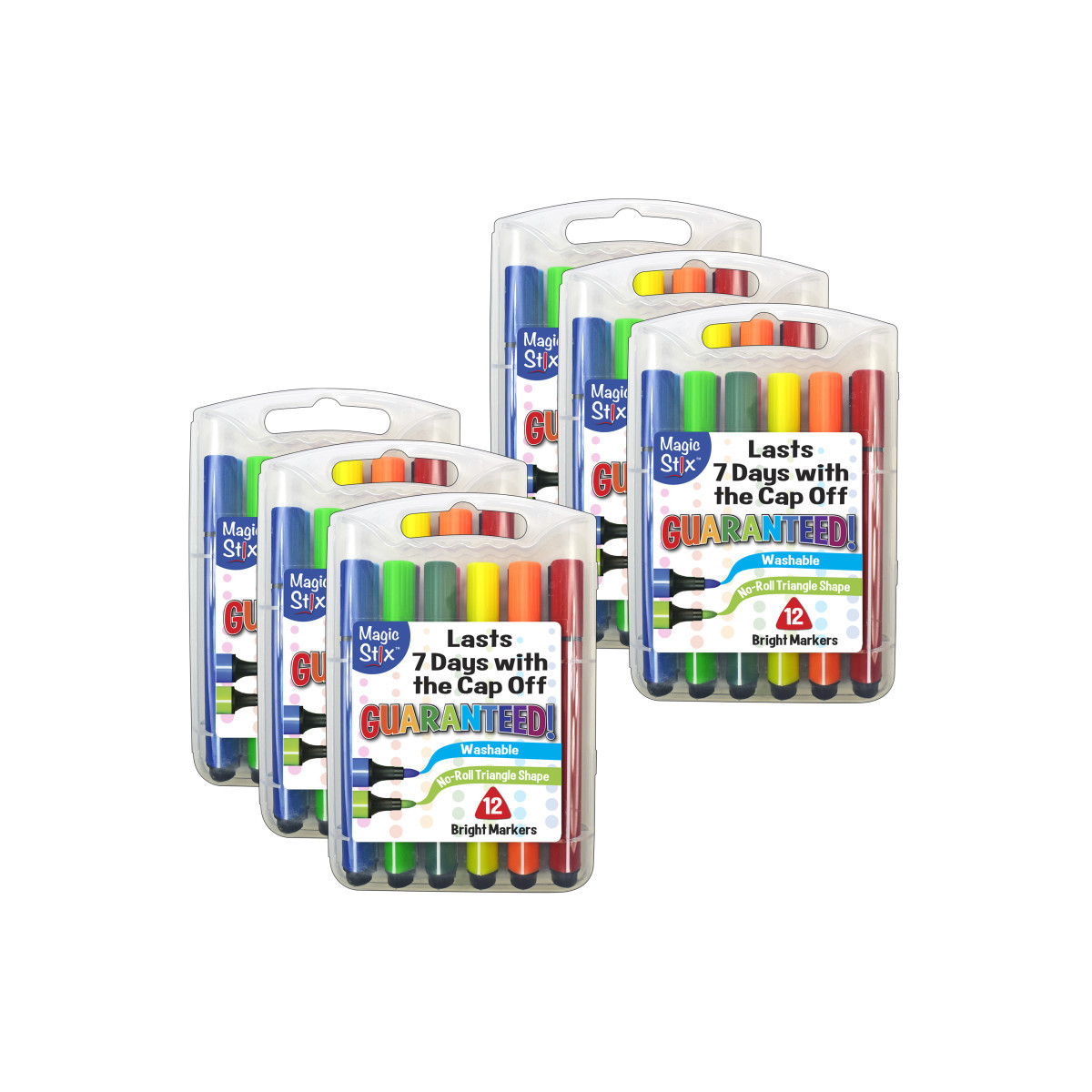 Magic Stix are GUARANTEED to bring long lasting color to the page with the cap off for up to 7 DAYS without drying out! They have a new, triangular shape to promote proper grip and help develop fine motor skills. Added bonus of the triangular shape- Magic Stix will not roll off your table or desk while working! With 12 classic colors, these washable and non-toxic markers will remain fresh use after use, project after project. Magic Stix are non-toxic and washable. Each pack includes 12 markers. Sold as 6 packs for a total of 72 markers.