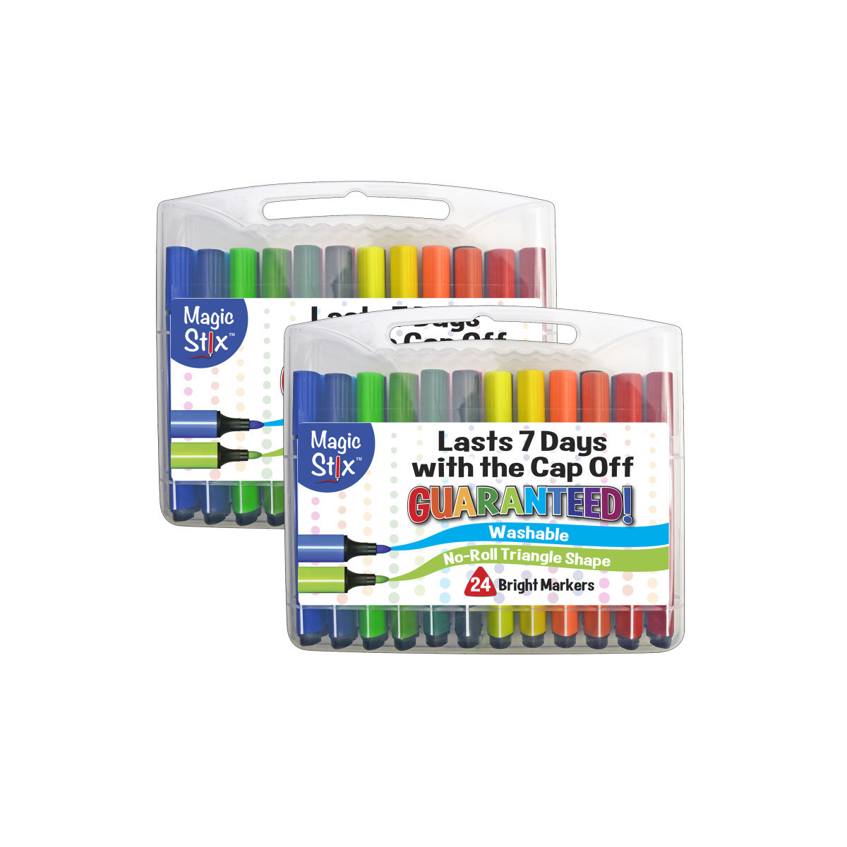 Magic Stix are GUARANTEED to bring long lasting color to the page with the cap off for up to 7 DAYS without drying out! They have a new, triangular shape to promote proper grip and help develop fine motor skills. Added bonus of the triangular shape- Magic Stix will not roll off your table or desk while working! With 24 classic colors, these washable and non-toxic markers will remain fresh use after use, project after project. Magic Stix are non-toxic and washable. Each pack includes 24 markers. Sold as 2 packs for a total of 48 markers.