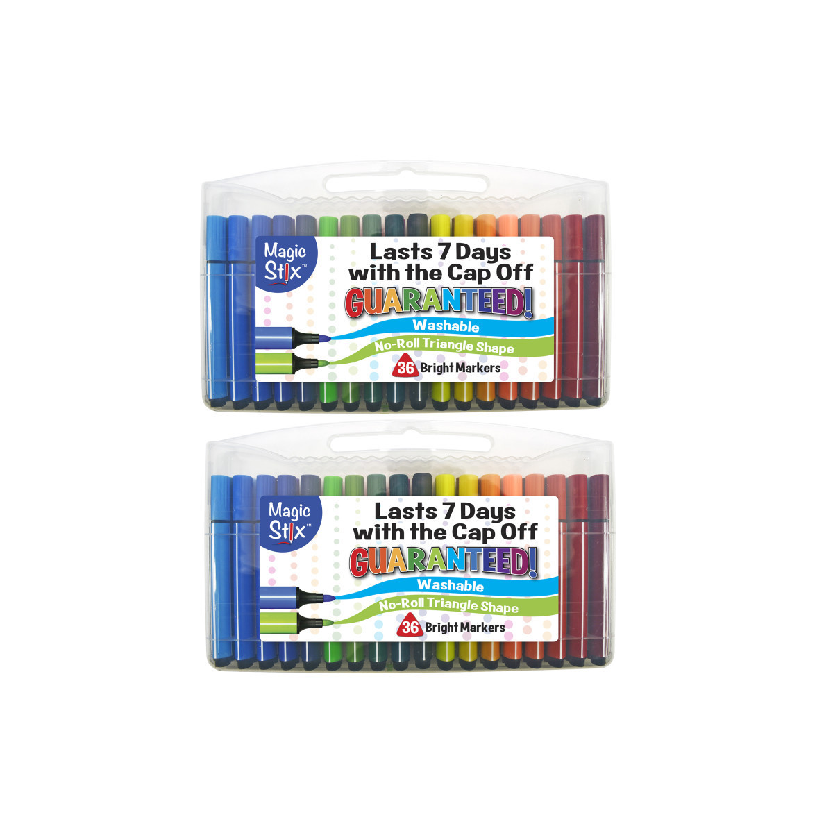Easy-Grip Triangular Markers that won't dry out! Featuring a never-roll triangular shape. Magic Stix markers are a revolutionary product to bring safe, creative fun to your crafts! Features a triangular shape to promote proper grip, and help develop fine motor skills. Magic Stix are guaranteed to bring long lasting color to the page with the cap off for up to 7 days without drying out. These washable and non-toxic markers will remain fresh use after use, project after project. Each pack includes 36 markers. Sold as 2 packs for a total of 72 markers.
