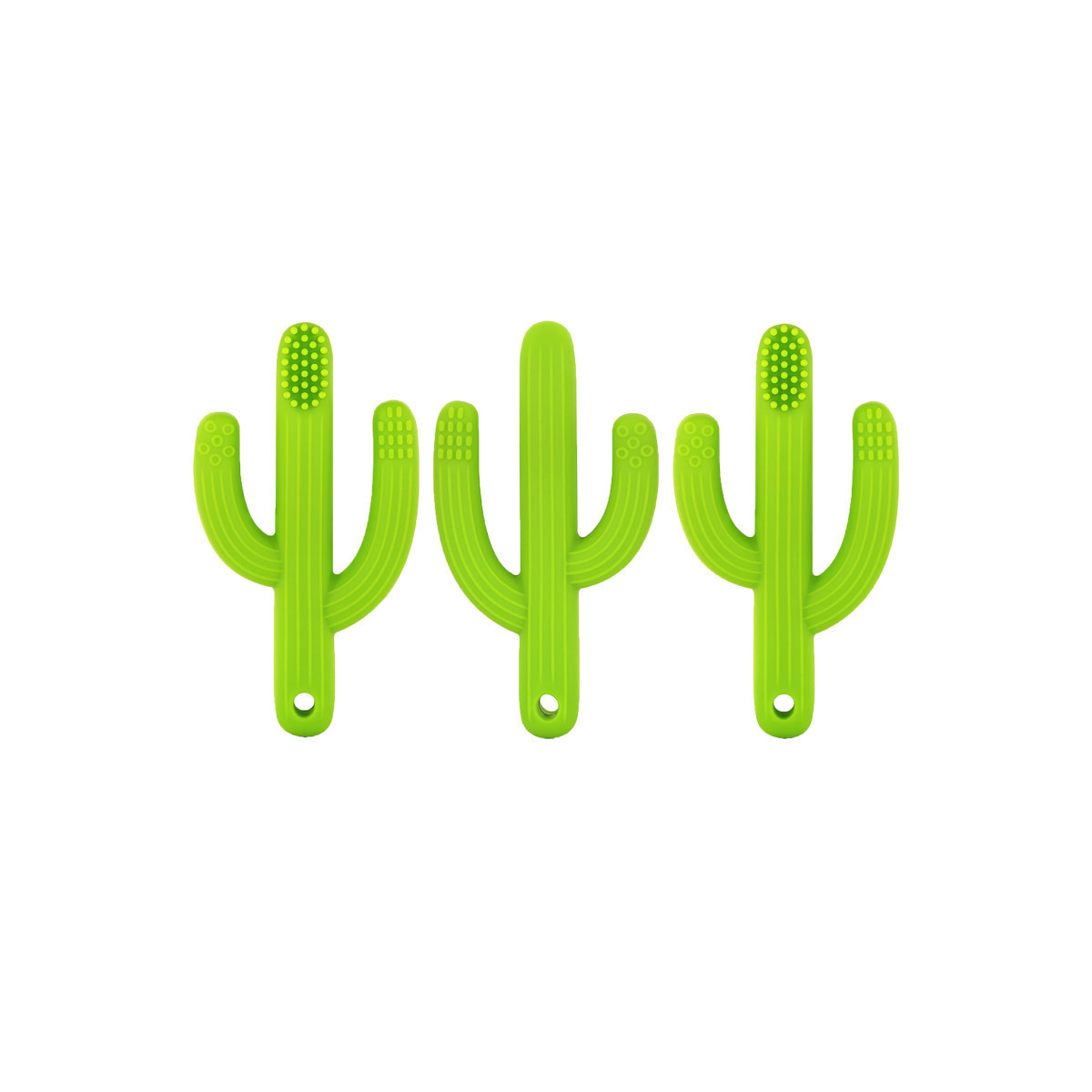 Green Cactus Toothbrush Teether features three different teething surfaces help teeth grow in healthy, sooth sore gums, keep baby stimulated and promote oral hygiene. Soft, silicone elastic bristles clean the mouth and reduce bacteria. Round and Long Massage Points massage the gums to effectively relieve teething discomfort. 100% safe! Made of FDA approved, non-toxic, food grade silicone. Free of BPA and Phthalates. Easy grip for small hands to help develop motor skills. Sold as a pack of 3 teethers.