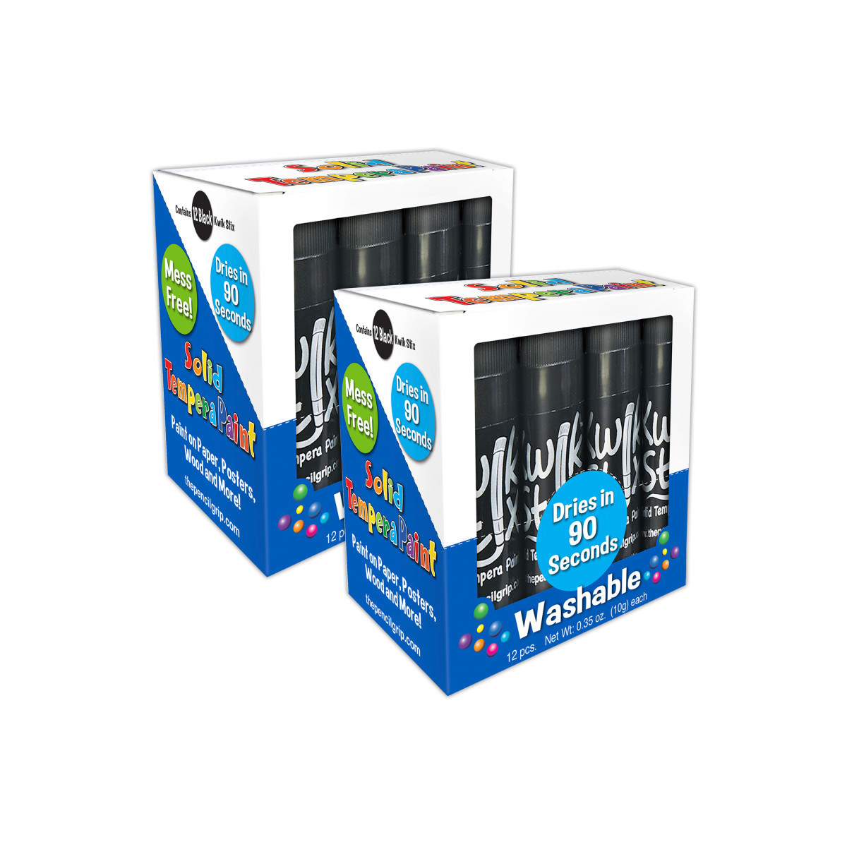 Single color Kwik Stix pack, great for projects needing certain colors replaced quicker than others. No cups, smocks, water or brushes needed. Great on poster paper, cardboard, wood and canvas - and MORE! These washable paints are non-toxic and nut, egg and gluten free. Simply uncap, twist and paint! Each box includes 12 Black Kwik Stix. Sold as 2 packs for a total of 24 Kwik Stix.