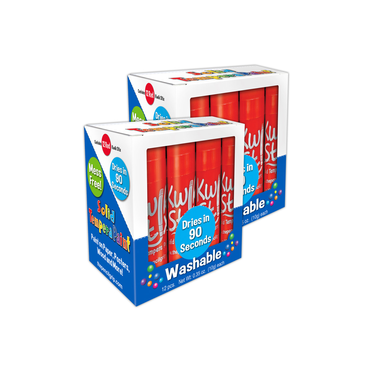 Single color Kwik Stix pack, great for projects needing certain colors replaced quicker than others. No cups, smocks, water or brushes needed. Great on poster paper, cardboard, wood and canvas - and MORE! These washable paints are non-toxic and nut, egg and gluten free. Simply uncap, twist and paint! Each box includes 12 Red Kwik Stix. Sold as 2 packs for a total of 24 Kwik Stix.