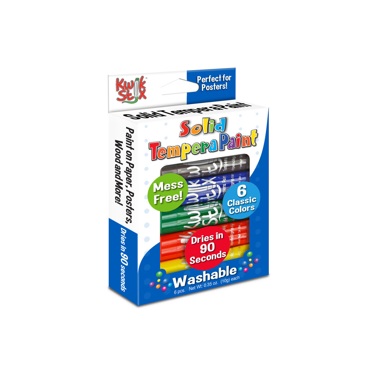 Tired of the endless mess of painting? Fear not! Kwik Stix Solid Tempera Paint sticks take the mess out of painting while keeping all the fun! Simply uncap, twist, and paint! Kwik Stix have a fast drying formula that allow them to dry in 90 seconds while still leaving a paint-like finish! No cups, smocks, water or brushes required. Kwik Stix come in assorted vibrant colors with coverage that won't crack. Great on poster paper, cardboard, wood and canvas. Pack of 6 assorted colors.