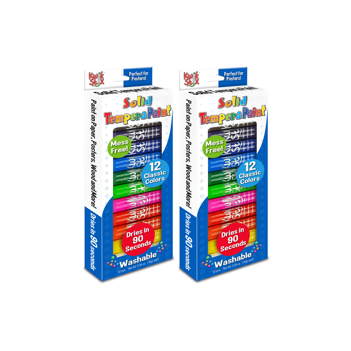 Tired of the endless mess of painting? Fear not! Kwik Stix Solid Tempera Paint sticks take the mess out of painting while keeping all the fun! Simply uncap, twist, and paint! Kwik Stix have a fast drying formula that allow them to dry in 90 seconds while still leaving a paint-like finish! No cups, smocks, water or brushes required. Kwik Stix come in assorted vibrant colors with coverage that won't crack. Great on poster paper, cardboard, wood and canvas. Each pack includes 12 assorted colors. Sold as 2 packs for a total of 24 Kwik Stix.