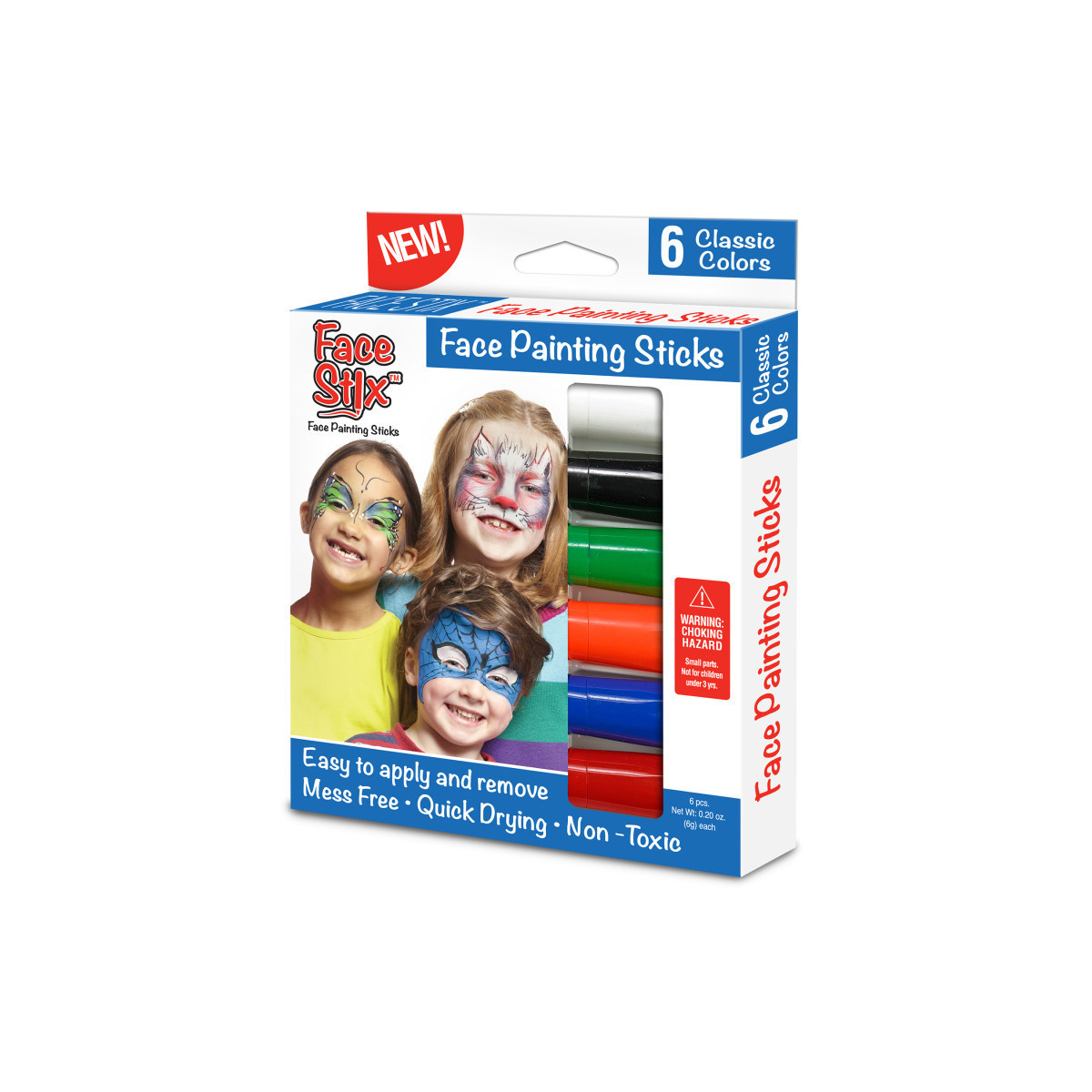 These sticks make face painting easier than ever! Paint is as easy to remove as it is to put on. There is no need for harsh scrubbing or removers. Simply washes off with a little soap and water. Face Stix are 100% safe, non-toxic and safe for everyone to enjoy. They are suitable for even the most sensitive skin. Face Stix offers a great variety of vibrant colors: green, red, yellow, red, black, white. Each pack includes 6 Face Stix.