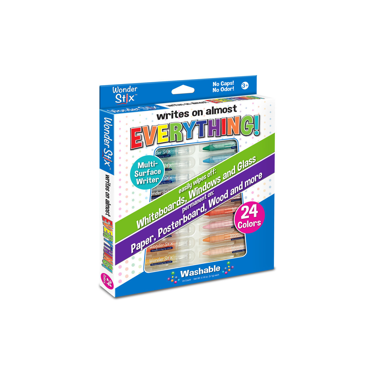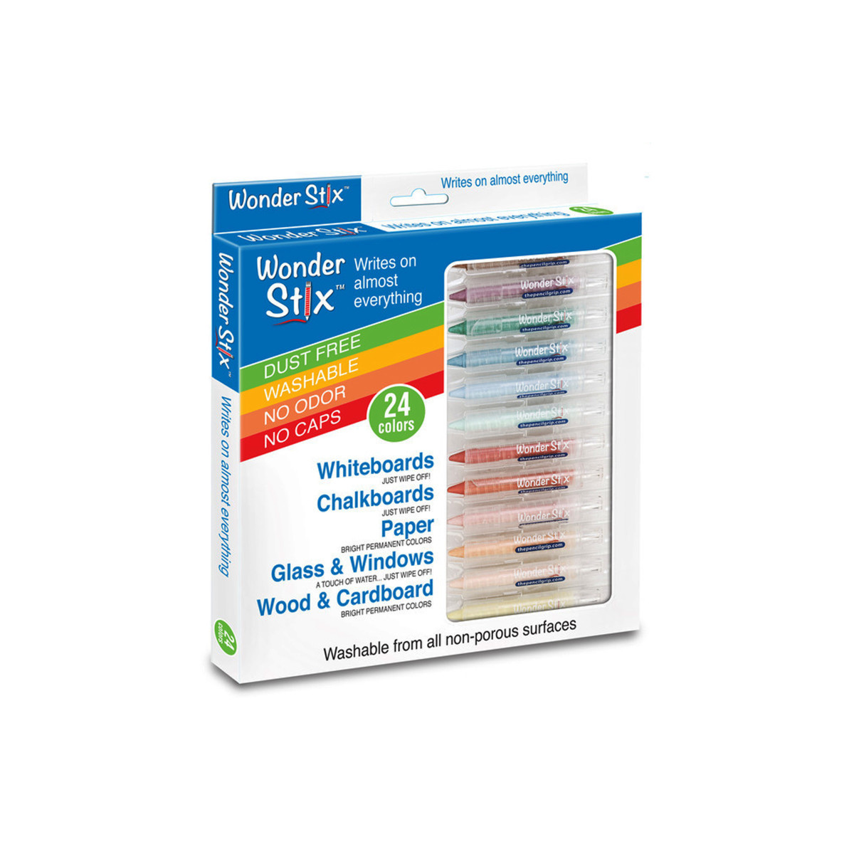 The Wonder Stix can just about write on any surface such as chalkboards, mirror, and wood and paper. It's easily washable from non-porous surfaces. Your imagination can run wild all over the house! Each box includes 24 bright colors.