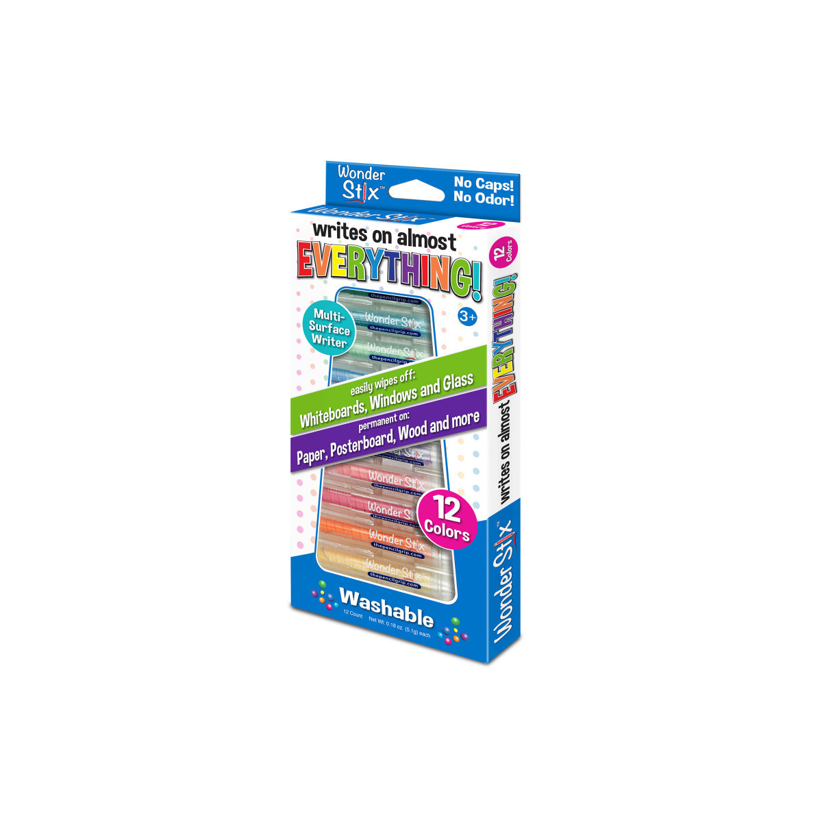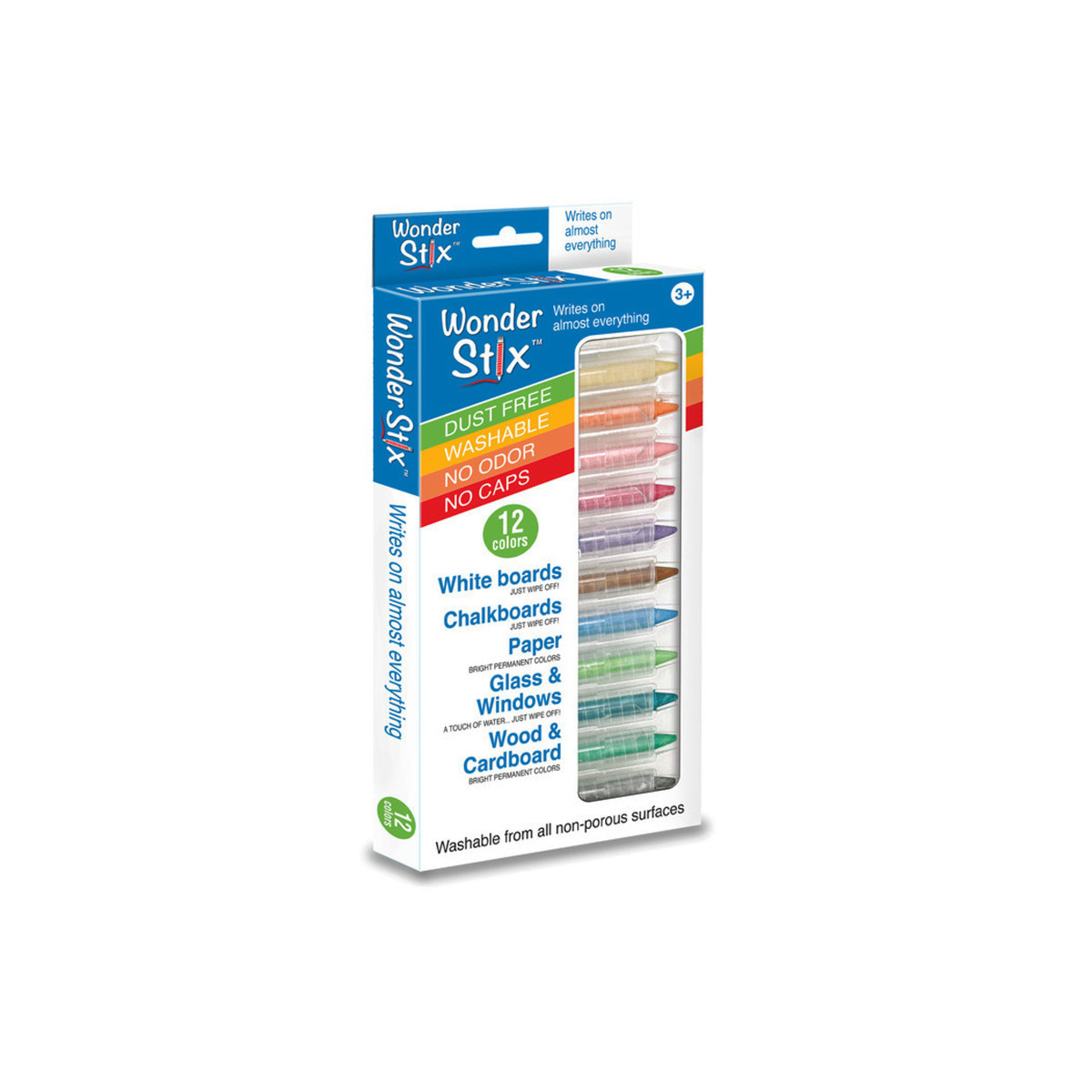 The Wonder Stix can just about write on any surface such as chalkboards, mirror, and wood and paper. It's easily washable from non-porous surfaces. Your imagination can run wild all over the house! Each box includes 12 bright colors.