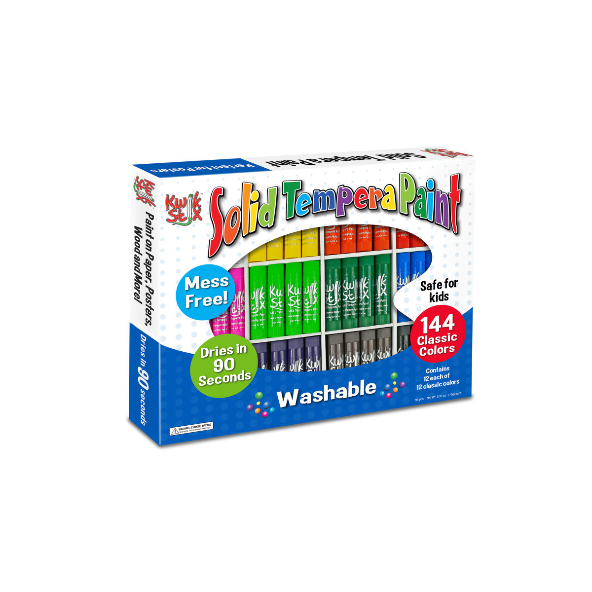 Tired of the endless mess of painting? Fear not! Kwik Stix Solid Tempera Paint sticks take the mess out of painting while keeping all the fun! Simply uncap, twist, and paint! Kwik Stix have a fast drying formula that allow them to dry in 90 seconds while still leaving a paint-like finish! No cups, smocks, water or brushes required. Kwik Stix come in assorted vibrant colors with coverage that won't crack. Great on poster paper, cardboard, wood and canvas - and MORE! Nut, Egg, and Gluten free! Non Toxic, Washable. Each pack includes 144 tempera paint stix, 12 each of 12 colors.