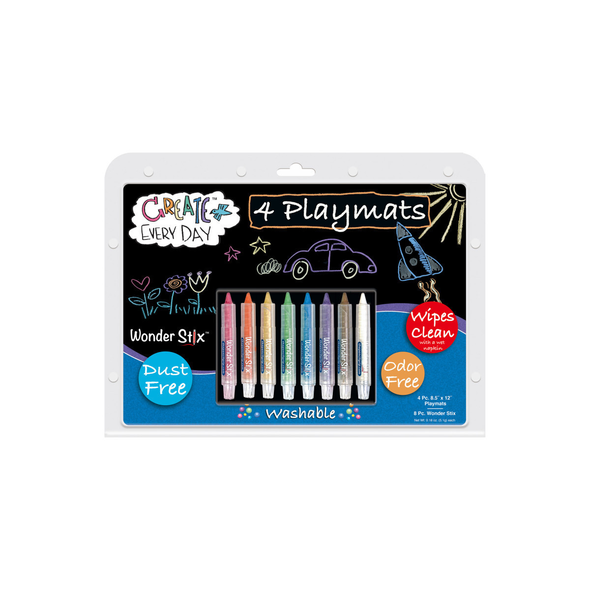 This set is great for travelling, play dates, dinner time, restaurants and more! Draw directly on the playmats, and remove with a damp cloth and start over and over again! Create everyday with this portable and mess free activity! Small kit includes (4) 8-1/2" x 12" playmats and (8) set of Wonder Stix.