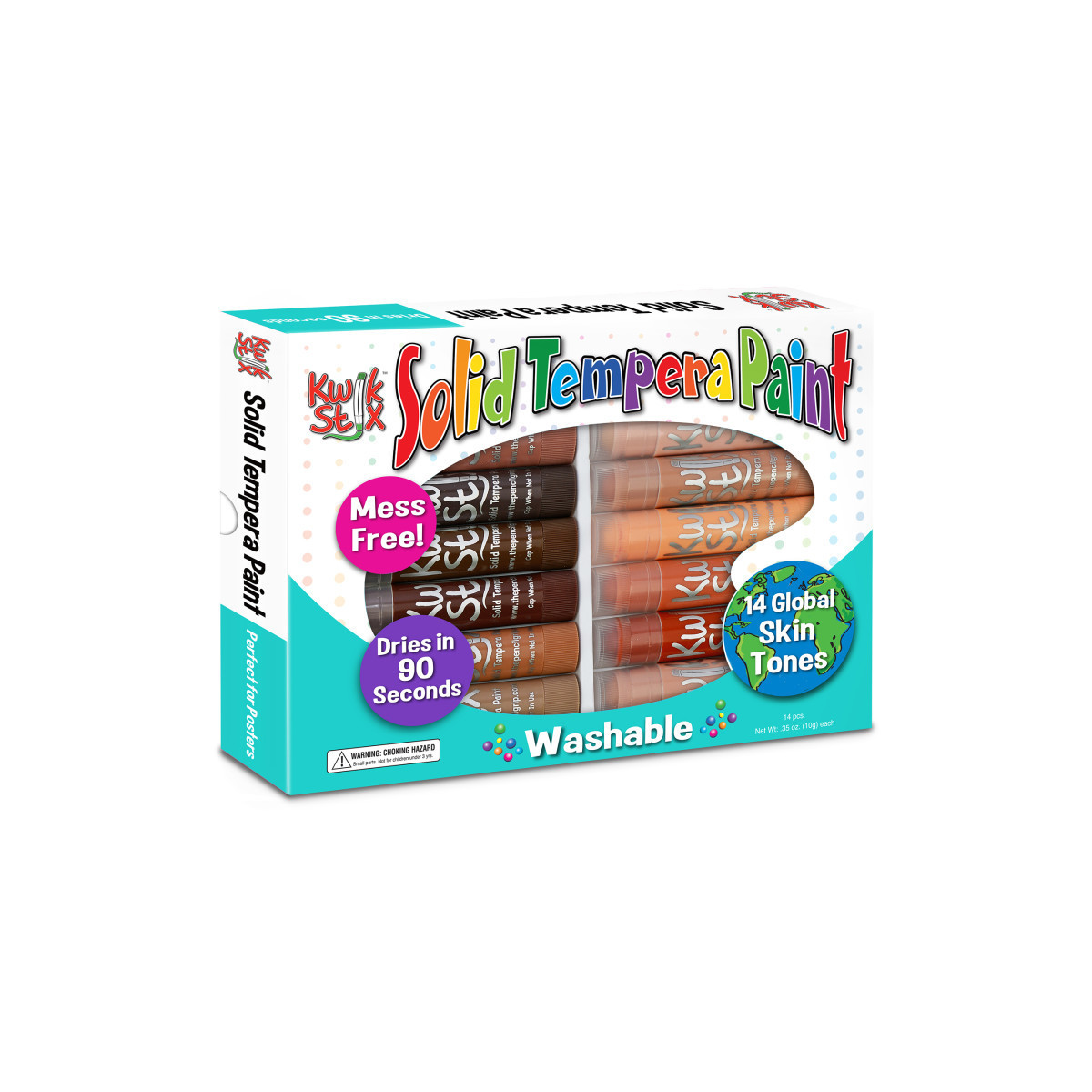 Tired of the endless mess of painting? Fear not! Kwik Stix Solid Tempera Paint sticks take the mess out of painting while keeping all the fun! Simply uncap, twist, and paint! Kwik Stix have a fast drying formula that allow them to dry in 90 seconds while still leaving a paint-like finish! No cups, smocks, water or brushes required. Kwik Stix come in assorted vibrant colors with coverage that won't crack. Great on poster paper, cardboard, wood, canvas, pumpkins and many more. Each pack includes 14 tempera paint sticks.
