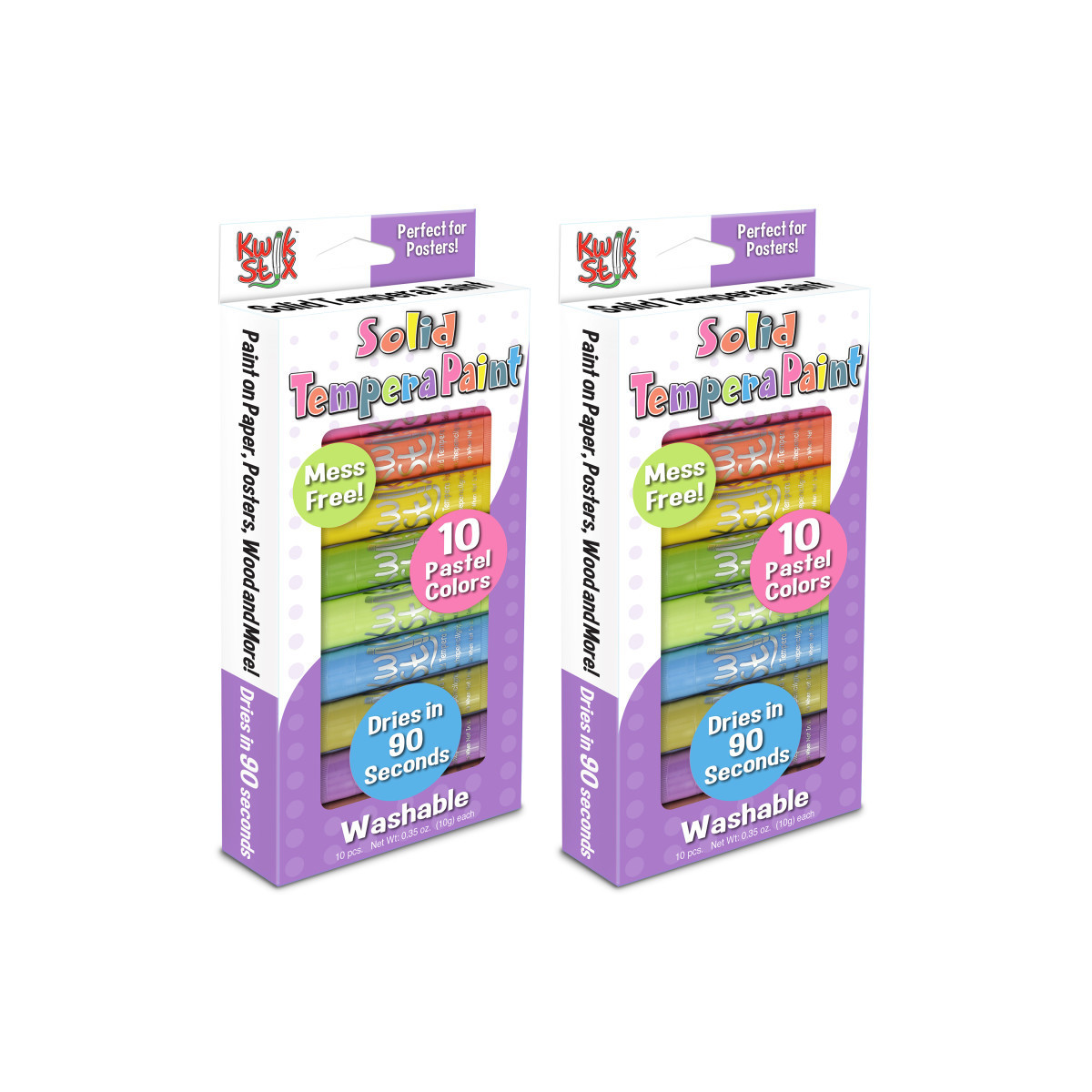 Tired of the endless mess of painting? Fear not! Kwik Stix Solid Tempera Paint sticks take the mess out of painting while keeping all the fun! Simply uncap, twist, and paint! Kwik Stix have a fast drying formula that allow them to dry in 90 seconds while still leaving a paint-like finish! No cups, smocks, water or brushes required. Kwik Stix come in assorted vibrant colors with coverage that won't crack. Great on poster paper, cardboard, wood, canvas, glass and more. Each pack includes 10 paint sticks. Sold as 2 packs for a total of 20 paint sticks.