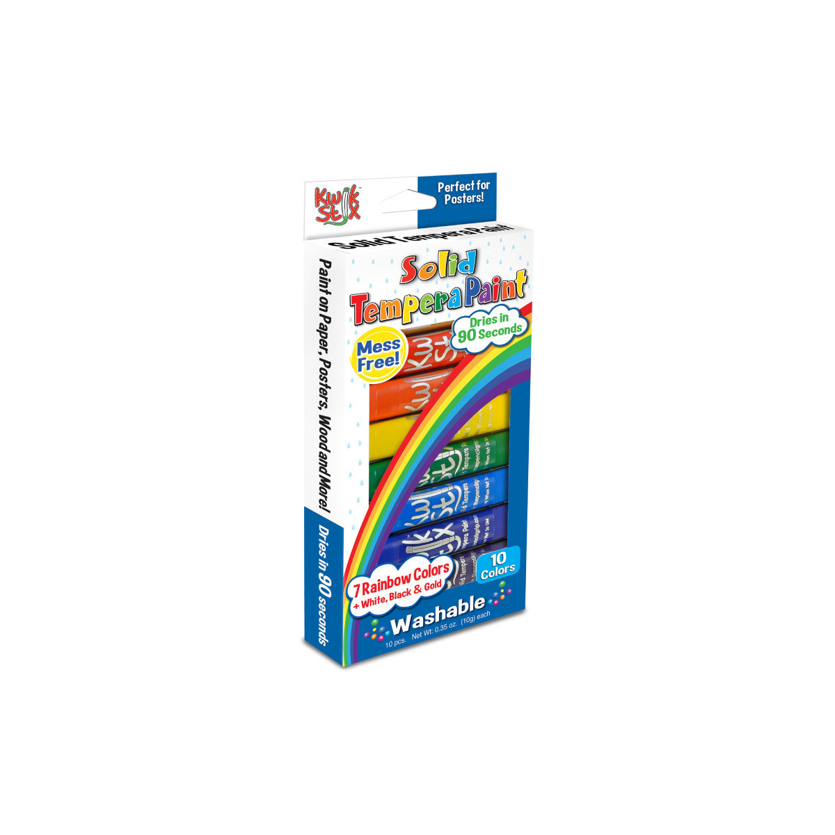 Tired of the endless mess of painting? Fear not! Kwik Stix Solid Tempera Paint sticks take the mess out of painting while keeping all the fun! Simply uncap, twist, and paint! Kwik Stix have a fast drying formula that allow them to dry in 90 seconds while still leaving a paint-like finish! No cups, smocks, water or brushes required. Kwik Stix come in assorted vibrant colors with coverage that won't crack. Great on poster paper, cardboard, wood and canvas - and MORE! Nut, Egg, and Gluten free! Washable and Non Toxic. Each pack includes 10 Kwik Stix in Rainbow Colors.