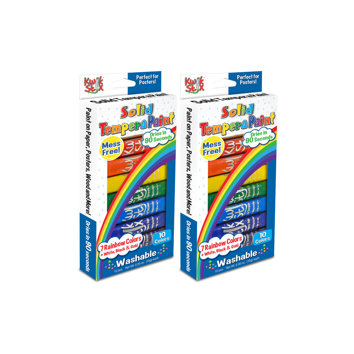 Tired of the endless mess of painting? Fear not! Kwik Stix Solid Tempera Paint sticks take the mess out of painting while keeping all the fun! Simply uncap, twist, and paint! Kwik Stix have a fast drying formula that allow them to dry in 90 seconds while still leaving a paint-like finish! No cups, smocks, water or brushes required. Kwik Stix come in assorted vibrant colors with coverage that won't crack. Great on poster paper, cardboard, wood and canvas - and MORE! Nut, Egg, and Gluten free! Washable and Non Toxic. Each pack includes 10 Kwik Stix in Rainbow Colors. Sold as 2 packs for a total of 20 Kwik Stix.