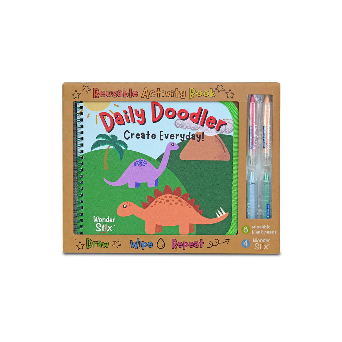 The Daily Doodler Reusable Activity Book with Dinosaur Front Cover & Create Everyday Back Cover. Reusable Activity Book: 8 wipeable blank pages plus 4 Wonder Stix. Includes pouch for Wonder Stix. Draw- wipe - repeat! Includes travel pouch for Wonder Stix. Wipes clean with a damp cloth to create over and over again!