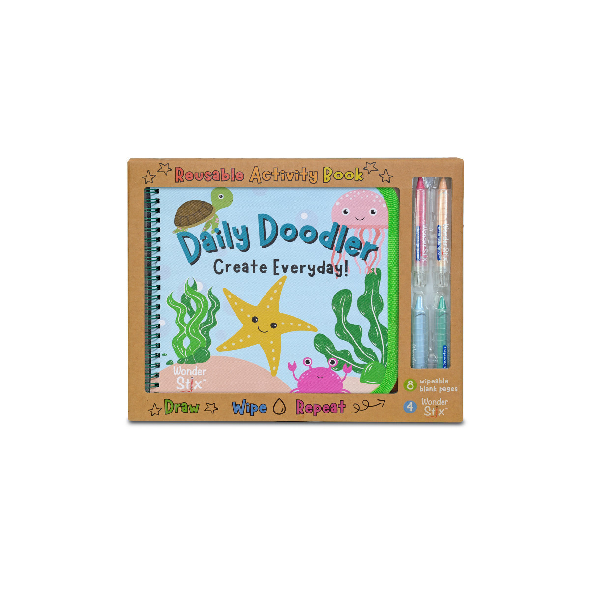 The Daily Doodler Reusable Activity Book with Sea Life Front Cover & Create Everyday Back Cover Reusable Activity Book: 8 wipeable blank pages plus 4 Wonder Stix. Includes pouch for Wonder Stix. Draw- wipe - repeat! Includes travel pouch for Wonder Stix. Wipes clean with a damp cloth to create over and over again!