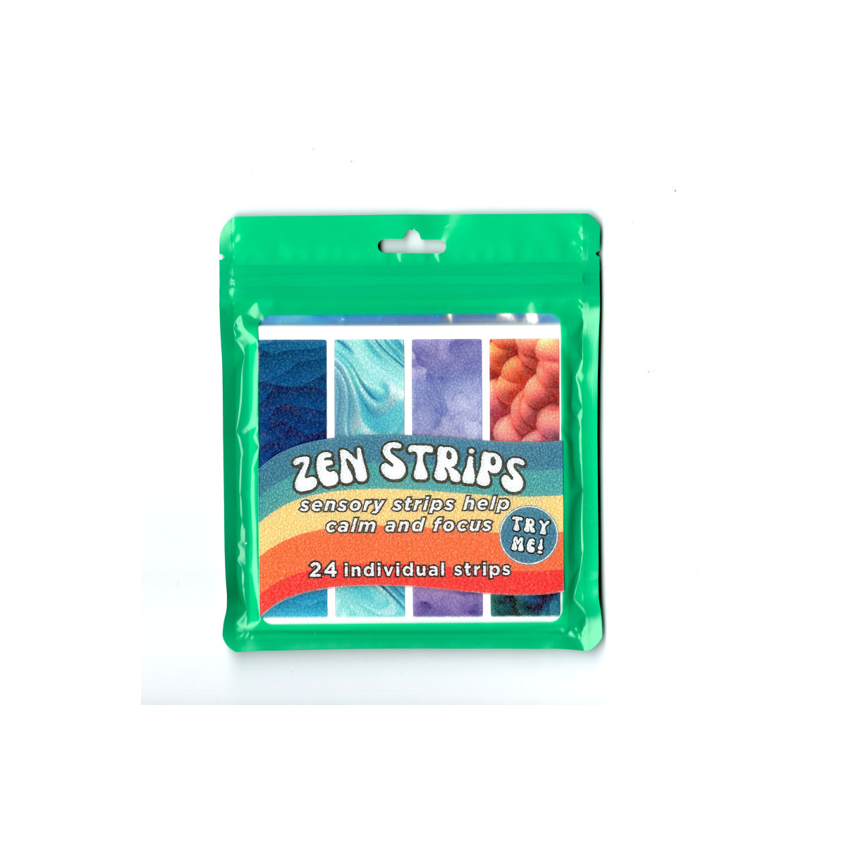 Sensory strips help calm and focus! Simply touch, swipe, scratch or fidget with Zen Strips to manage stress, boost concentration and enjoy a calming effect. This set includes 24 Zen Strips with a raised grainy texture in various blue, purple, pink and orange gradient designs. With an easy peel, stick, and press application, use on your everyday items including smartphones, laptops, tablets, or even water bottles. Manufactured using non-toxic, child-friendly materials.