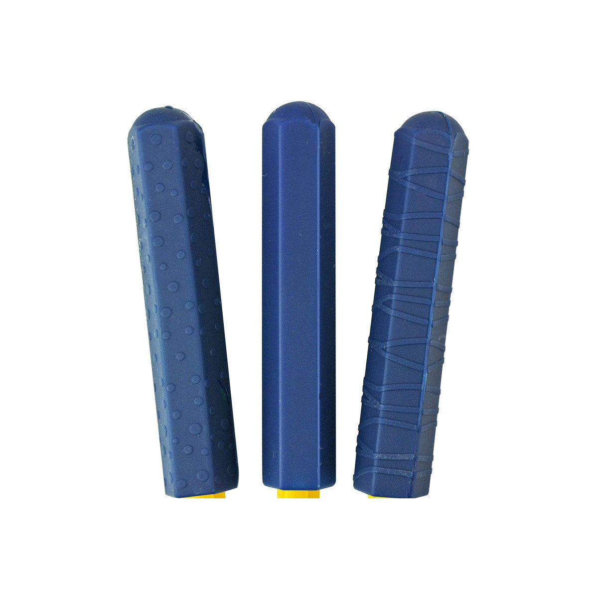 Chewberz are prism-shaped chewy pencil toppers that feature a closed rounded top; a discreet new chewy tool that's great for self-regulation and focusing oral sensory input. They also add a nice touch of weight to hand writing tools. This oral motor set includes 3 chewy fidget toppers in 3 assorted textures: smooth, dotted, and ridged. These latex-free chewable pencil toppers come in a neutral navy color and fit standard-size pencils and pens. Designed for mild to moderate chewers, ages 5-adults.