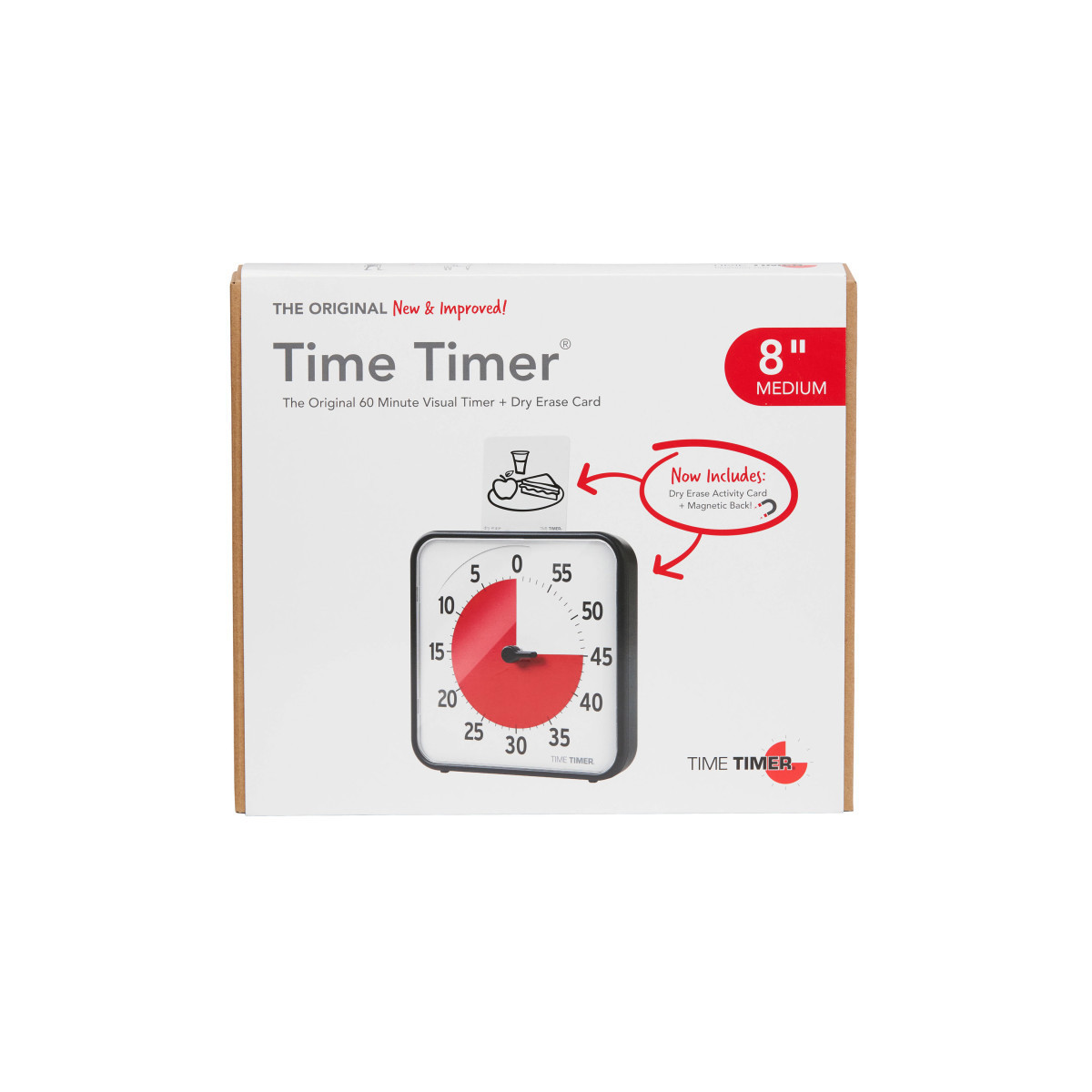 Visually count down the minutes using the Time Timer Original 8" Medium. This patented visual timer displays time in a concrete way - the red disk disappears as time elapses, making time easily and quickly understood by all ages, grade levels, and abilities, with just a quick glance. Sized for small groups or rooms. It's simple to set any duration up to 60 minutes. Time begins counting down automatically. The Time Timer Original 8" includes a clear protective lens. Timer includes a built-in slot on top for PEC placement and includes a Dry Erase Card for activity management. No loud ticking and optional alert. Requires two AA batteries (not included).