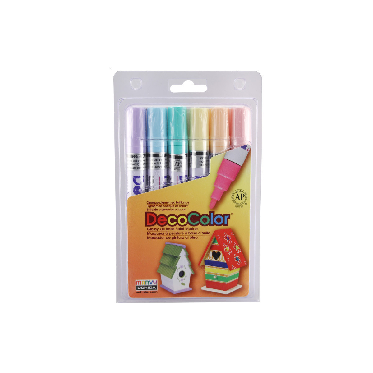 Use these DecoColor® Broad Point paint marker pen to write out large messages on glass or mirrors or to cover a larger surface area on other projects. The larger tip of this paint pen allows for a quick covering of any glass, paper, wood, clay, porcelain, stone, metal, or mirror surface. The paint is acid-free, lightfast, weatherproof, and pigmented. Each pack includes 6 markers, 1 each of pale violet, cream yellow, pale blue, pastel peach, peppermint, and blush pink.