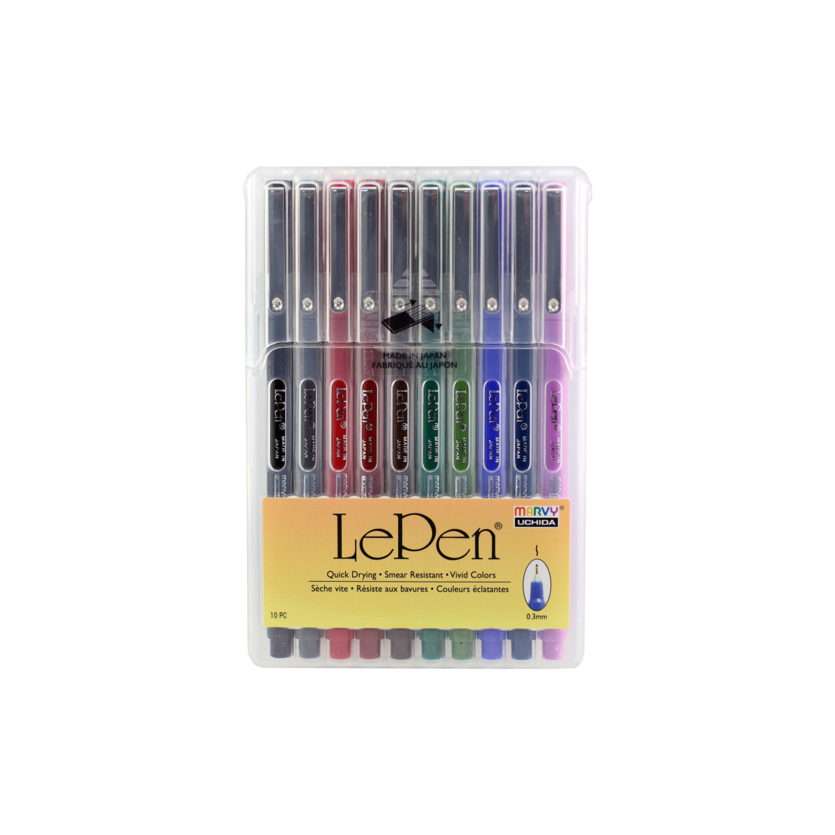 The LePen has a smooth writing micro-fine plastic point and a sleek barrel design. The ink is acid free and non-toxic. This is a 10 piece Dark Color set. Good for business forms, notebooks, diaries, memo pads, letters, journals, yearbooks, and scrapbooks. This set includes 1 each color black, red, blue, green, brown, lavender, olive green, dark grey, burgundy, and oriental blue.