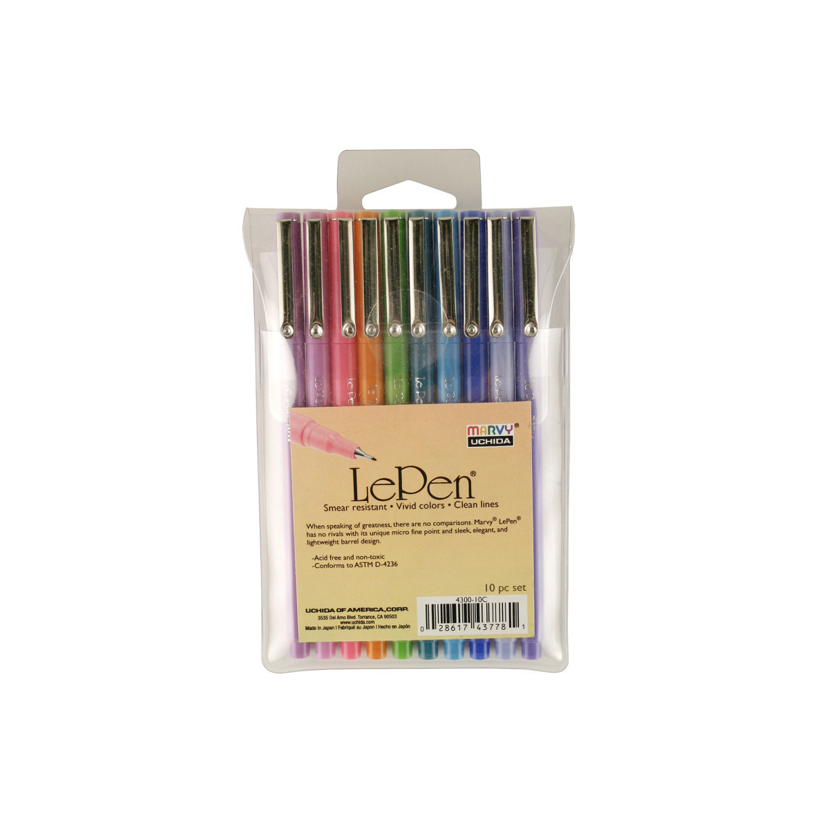 The LePen has a smooth writing micro-fine plastic point and a sleek barrel design. The ink is acid free and non-toxic. This is a 10 piece Bright Color set. Good for business forms, notebooks, diaries, memo pads, letters, journals, yearbooks, and scrapbooks. This set includes 1 each color blue, orange, lavender, pink, light blue, light green, teal, orchid, periwinkle, and amethyst.