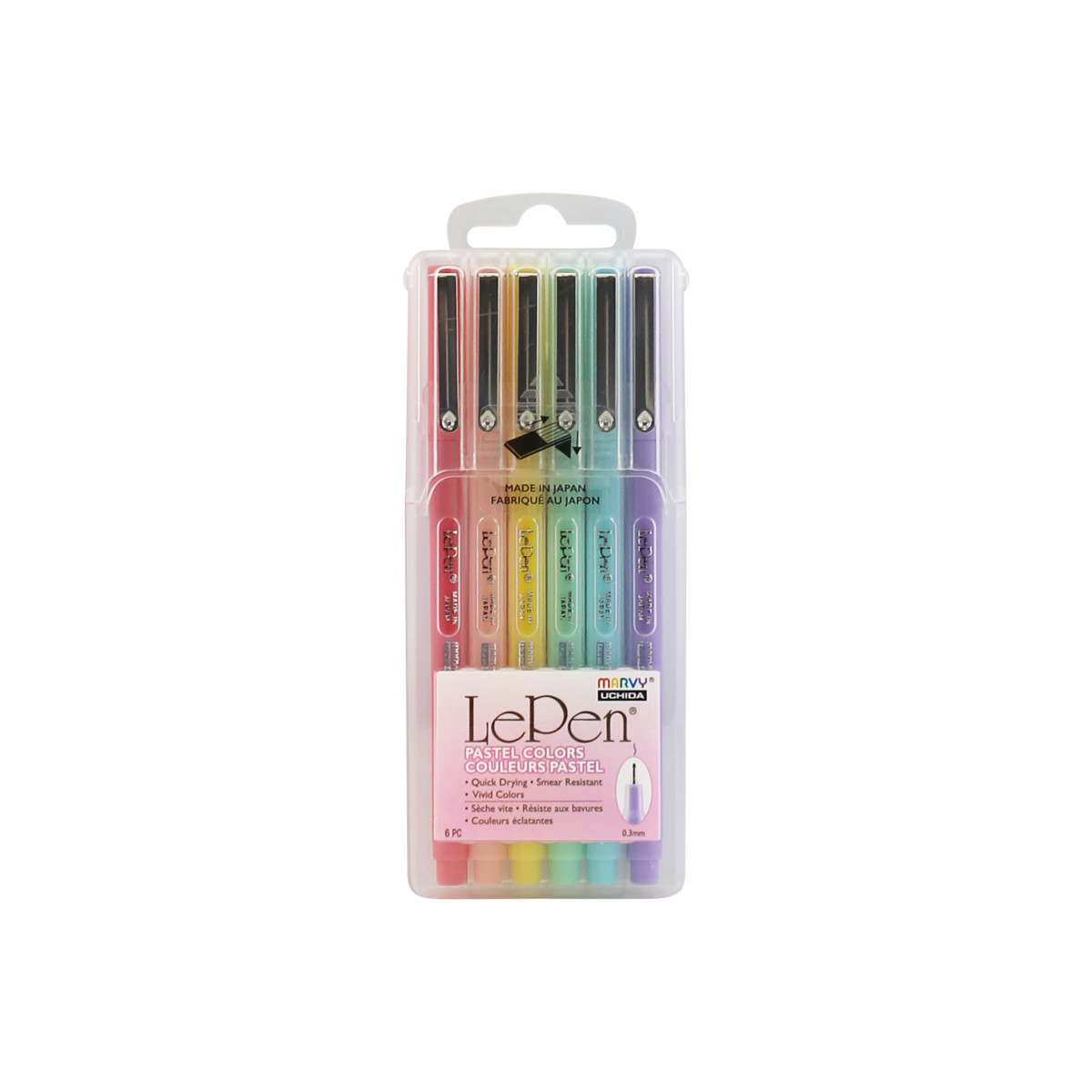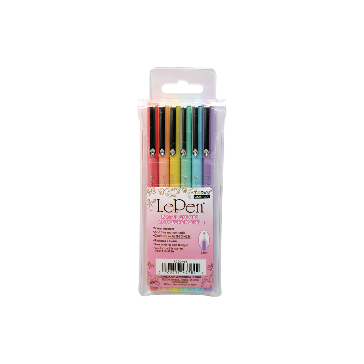 The LePen has a smooth writing micro-fine plastic point and a sleek barrel design. The ink is acid free and non-toxic. This is a 6 piece Pastel set. Good for business forms, notebooks, diaries, memo pads, letters, journals, yearbooks, and scrapbooks. This set includes 1 each color coral pink, pastel blue, pastel peach, peppermint, wisteria, and yellow.