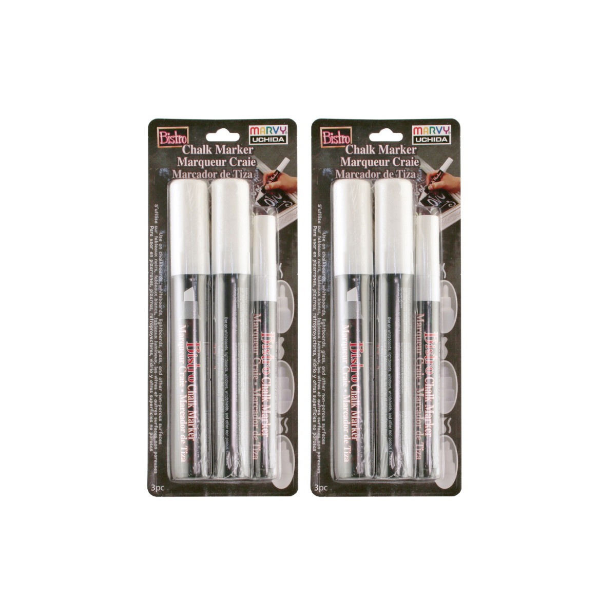 Bistro Chalk Markers are the perfect every day chalk marker. These chalk markers work on chalkboards, dry erase boards, light boards, windows, windshields, and other non-porous surfaces so you can write or create art virtually anywhere. These markers come in 19 colors and are opaque, water-based, and pigmented. Clean up is super easy, they are erasable with a damp cloth. Each pack includes 3 markers in 3 sizes: 3 mm fine, 6 mm broad, and chisel. Sold as 2 packs for a total of 6 markers.