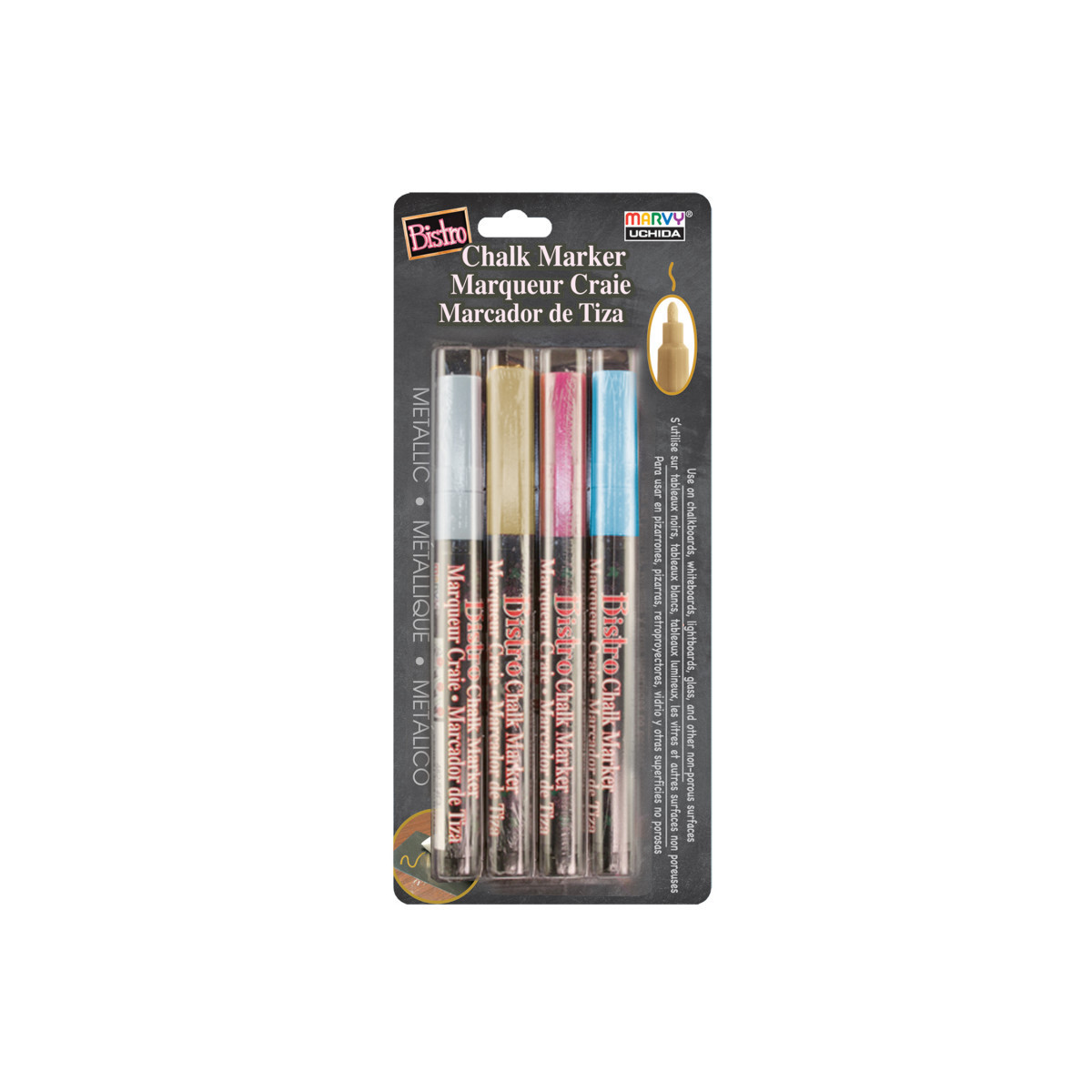 Use Metallic Bistro Chalk Markers on seasoned chalkboards, light boards, dry erase boards, mirrors, windows, windshields and most non porous surfaces. These Metallic Chalk Markers are a great way to add metallic colors to your chalk creations. These great markers are opaque, water based, pigmented and erasable with a damp cloth. Bistro Chalk Marker Fine Point Metallic 4-Piece Set includes 4 colors: Gold, Silver, Metallic Red, Metallic Blue.