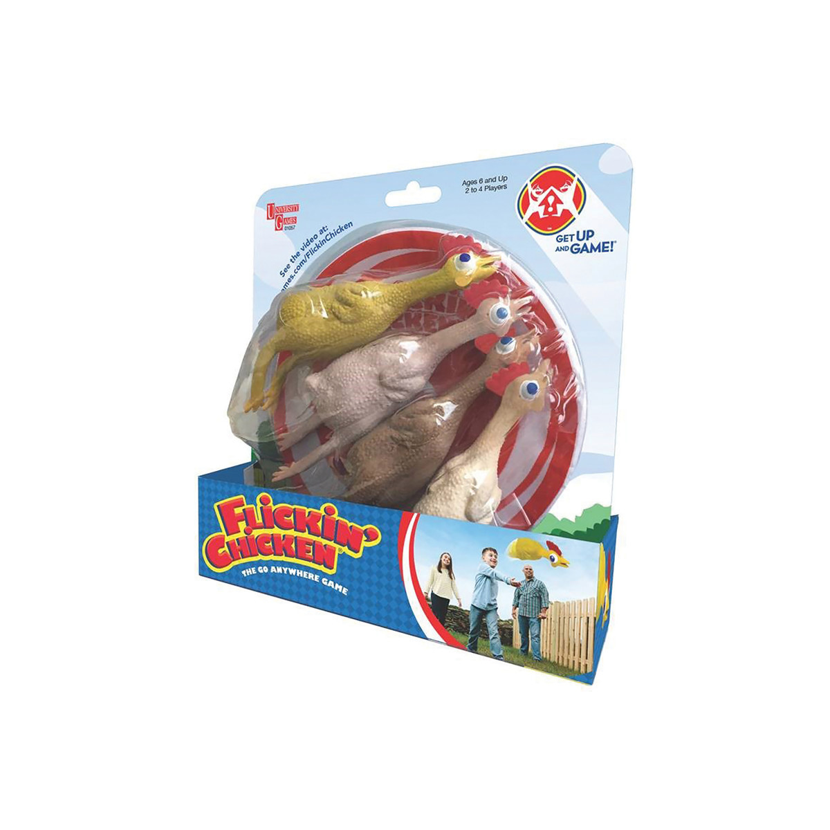 They bounce, they roll, but can you hit the target? Nine rounds of CHICKEN THROWING INSANITY! Flickin' Chicken is the go-anywhere game that is perfect for the backyard, the park, family outings, tailgating, the beach, camping, and more! It's this easy:?