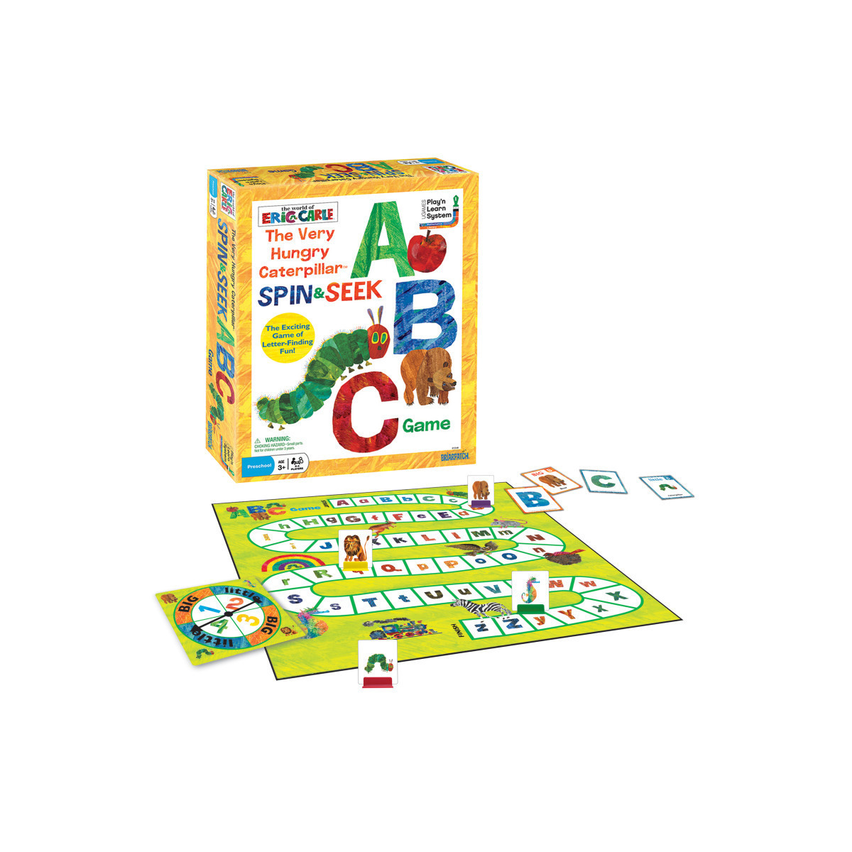 In the Spin & Seek ABC Game, children explore the alphabet and learn the difference between big and little letters. Players spin the spinner and seek matching letters with images inspired by The World of Eric Carle. The World of Eric Carle encourages playful learning. With The Very Hungry Caterpillar as its centerpiece, the brand has touched the lives of children around the world for three generations through Eric Carle's timeless stories and vibrant artwork. Game includes: game board, spinner, 52 image cards, 4 playing pieces, and instructions. For 2 to 4 players, ages 3 and up.