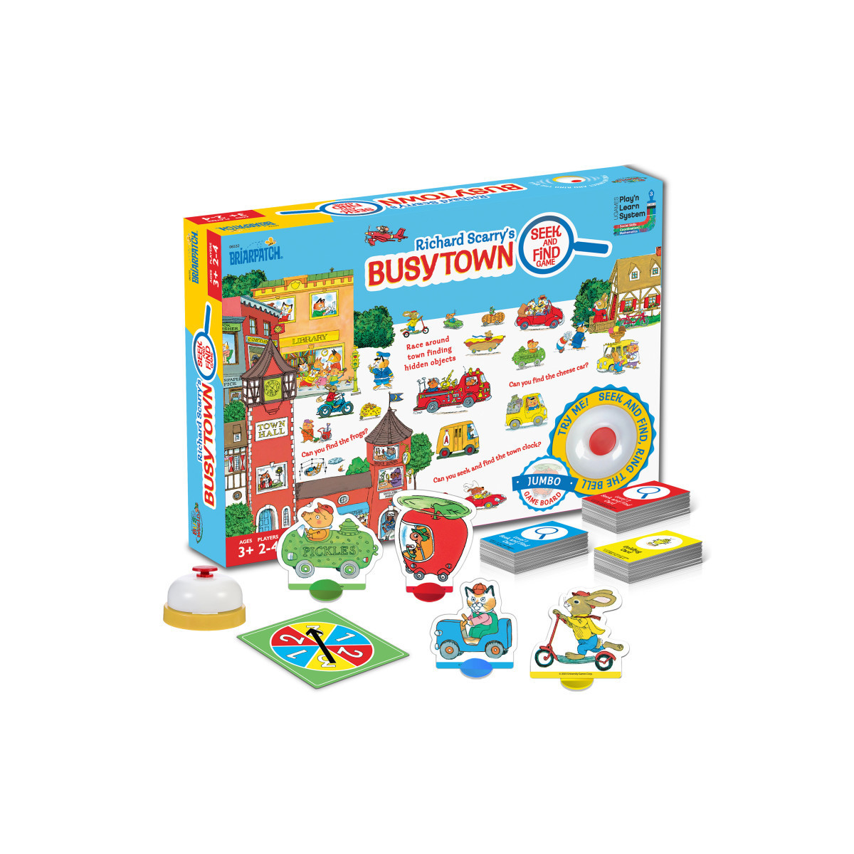 Richard Scarry Seek and Find Game is fun for 2-4 players. Preschoolers race around Busytown to seek and find their items on the 40" long Busytown game board. Be the first to ring the bell and win the card. Collect 5 seek and find cards to win the game! Players compete to find objects hidden on the jumbo 40-inch long gameboard. Features two levels of play for both younger and older players. Jumbo Game Board, 112 Playing Cards (50 Level 1 Seek and Find Cards, 50 Level 2 Seek and Find Cards, 12 Goldbug Cards), Spinner, Bell, 4 Character Pawns with Bases, Instructions