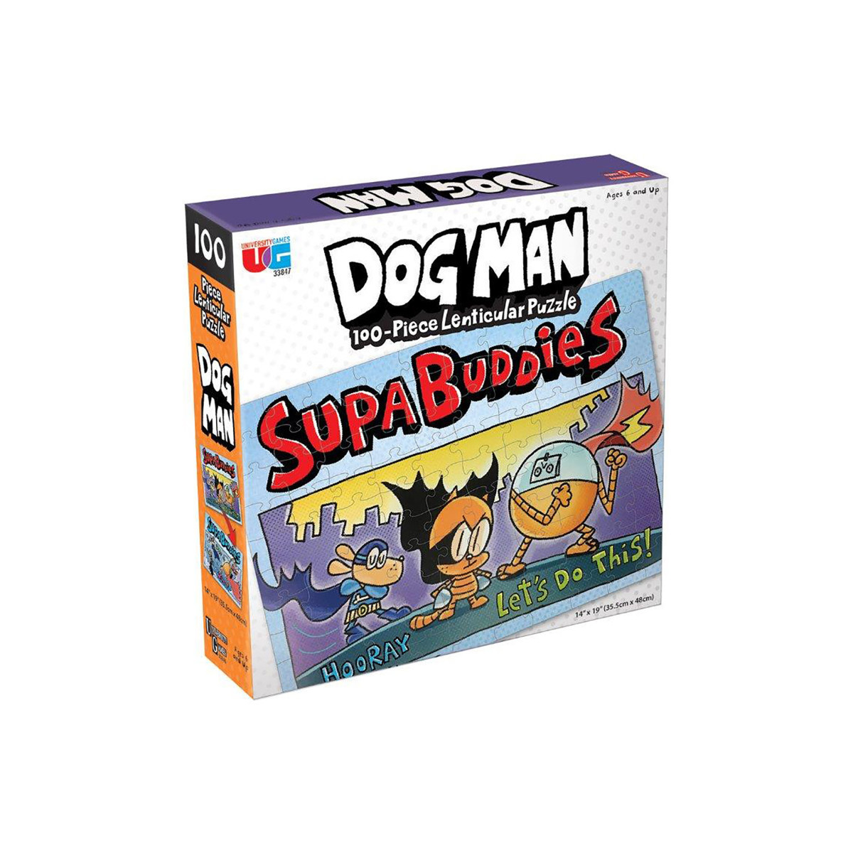 The Dog Man Supa Buddies take off for battle in this 100-piece lenticular puzzle. Two puzzles in one create a fun and exciting challenge! Features dynamic images straight from the #1 New York Times Bestselling series. Puzzle measures 14" x 19" when completed.