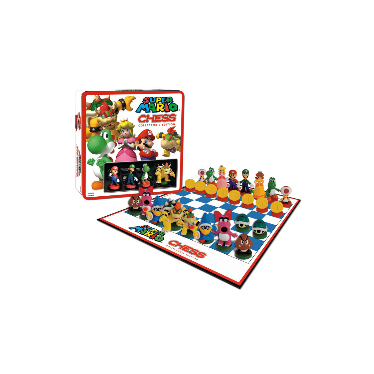 Mario and Bowser are battling again; this time in the Classic Games of Chess! Pick your team and take control of 32 hand-painted playing pieces including: Mario, Luigi, Bowser, and more. This unique game comes in a collectible tin box that showcases the custom checkerboard featuring Mario and Luigi hats.