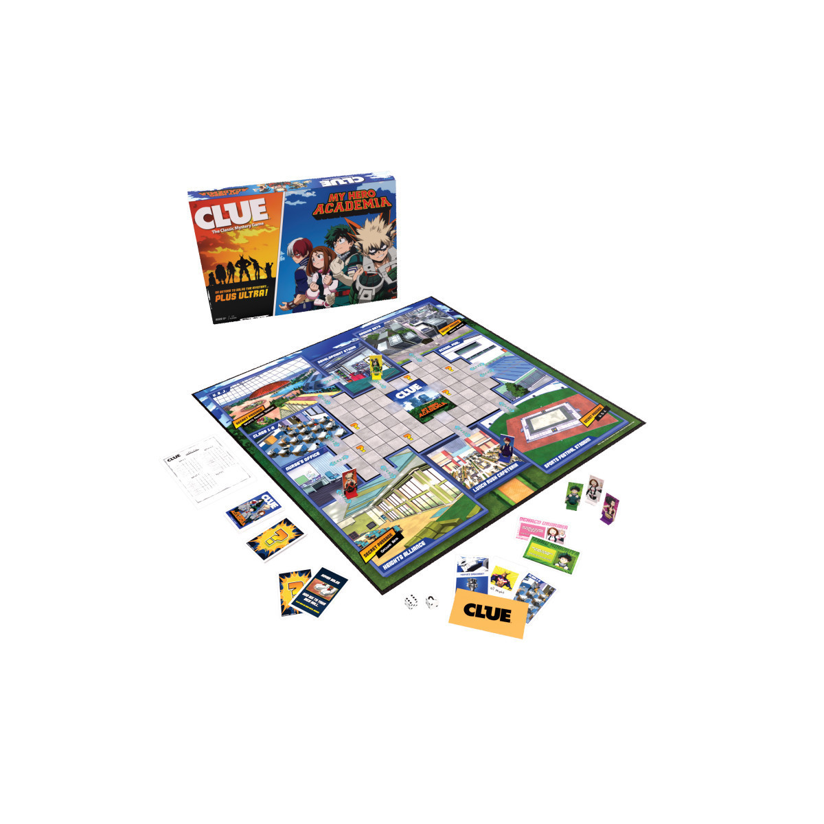 Do you have what it takes to be the top student detective? In CLUE®: My Hero Academia, Aizawa has set up a challenge for the aspiring heroes of Class 1-A: Recover a classmate who's been kidnapped by a teacher in disguise! Taking on the role of Izuku Midoriya and other top students, investigate well-known locations across the U.A. campus and solve WHO is posing as the culprit, WHAT piece of evidence leads to them, and WHERE they are hiding. Go beyond and solve the mystery... PLUS ULTRA!