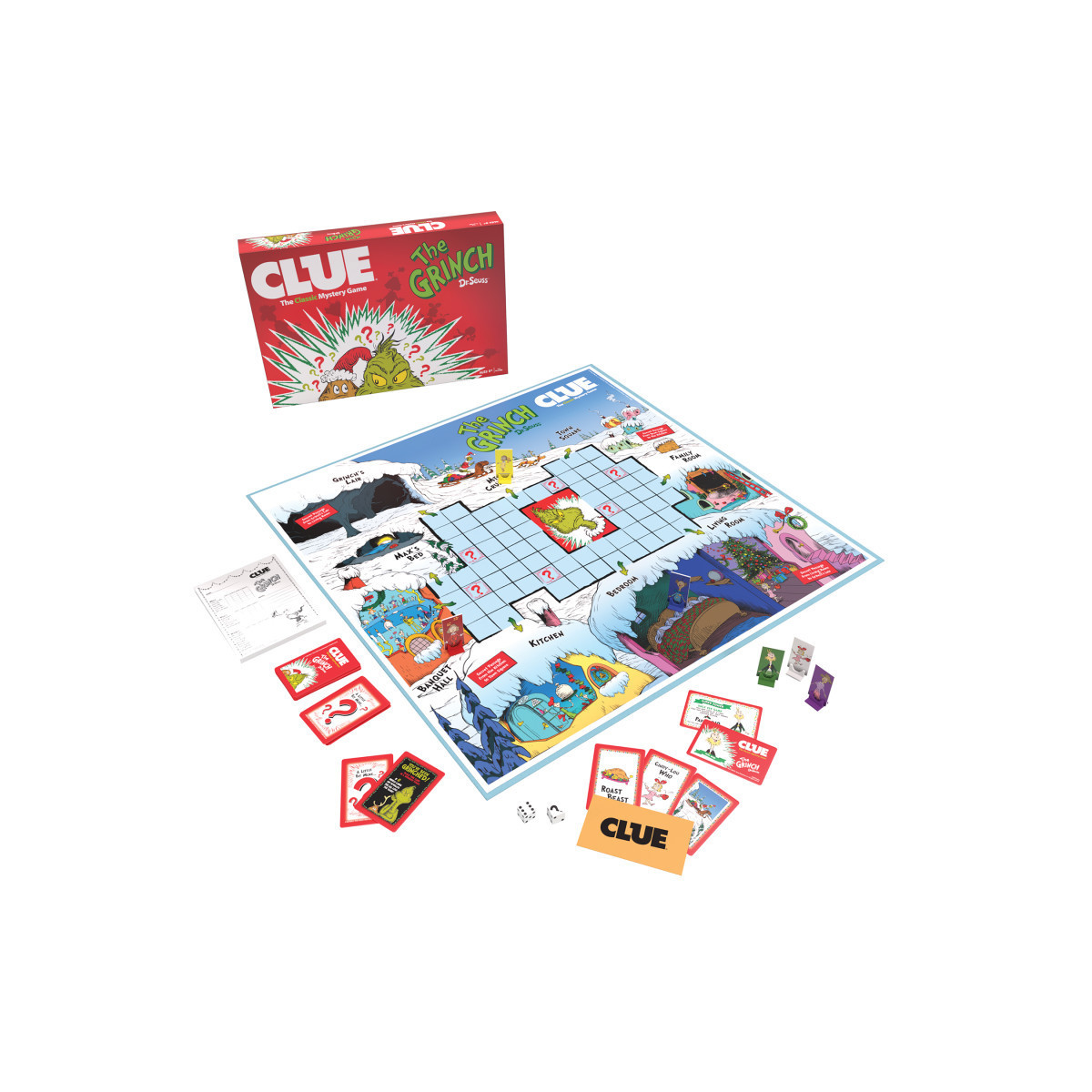 A timeless holiday theft is up to you to solve in this nostalgic version of the classic mystery game! Based on Dr. Seuss's story about the grouchy green troublemaker that hijacks Whoville's decorations, CLUE: How the Grinch Stole Christmas lets players wear the shoes of Cindy-Lou, Papa Who, and other residents of Whoville to determine WHO caught "the mean one" in the act, WHAT object The Grinch stuffed up the chimney, and WHERE in the town it was taken from! For 2-6 players, ages 8+.