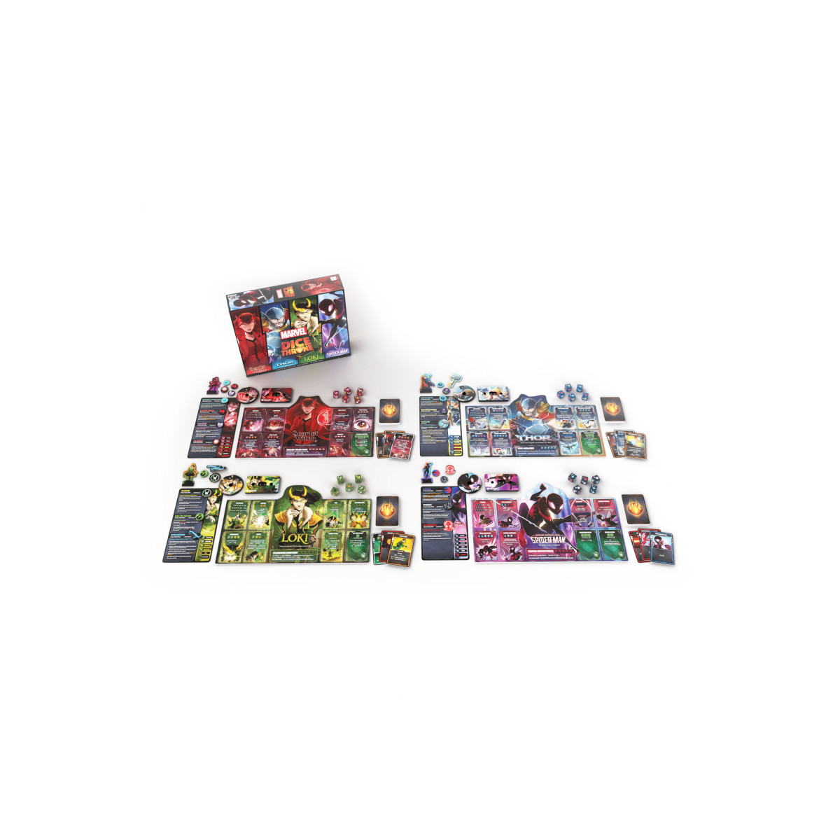 This Marvel Dice Throne 4 Hero Box puts players in the roles of Scarlet Witch, Thor, Loki, and Spider-Man, each with their own set of dice, player board, and unique deck of cards