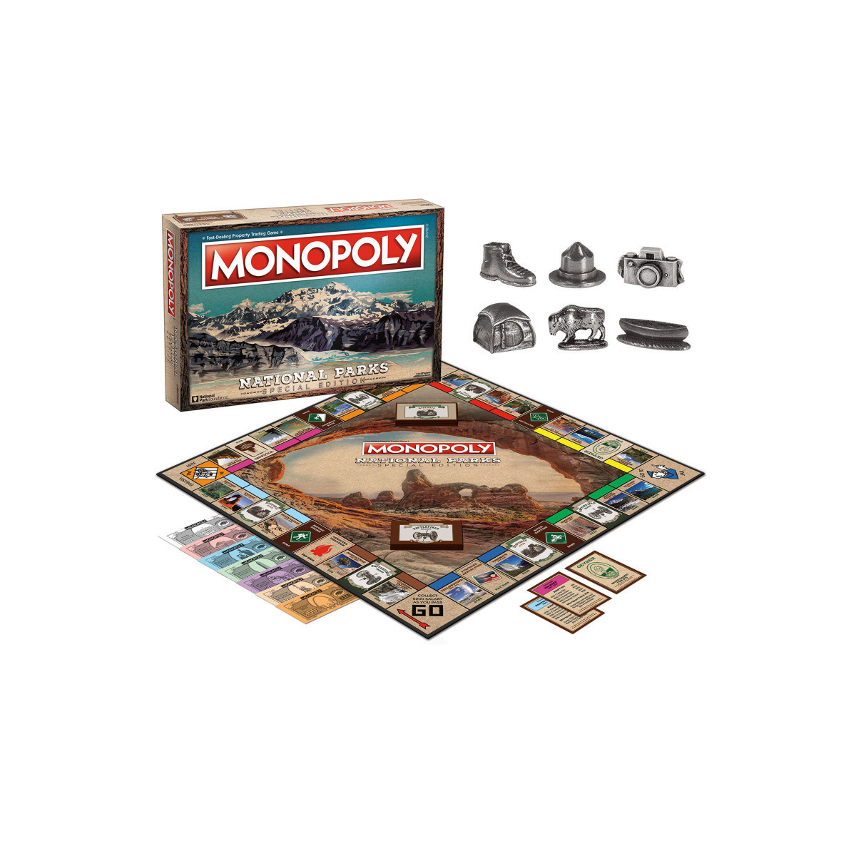 Celebrate the beauty of America's National Park system with MONOPOLY: National Parks. The game features over 60 of the most beautiful and historic sites in America from the stunning landscape of the Grand Canyon to the awe inspiring wonder of Yellowstone. Also featured in the game are the animals that have captured our hearts and curiosity and call the national parks home. Journey into the heart of America without ever leaving home with MONOPOLY: National Parks Edition. For 2-6 players ages 8 and up.