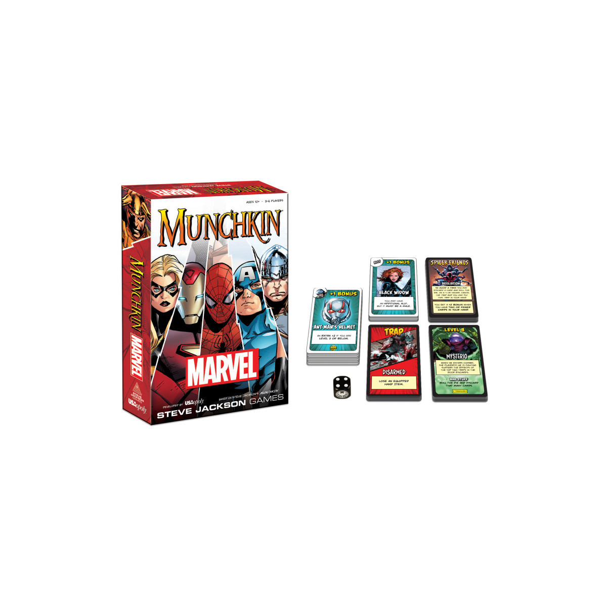 MUNCHKIN Marvel Edition is an all-new Munchkin game that fuses the fun of monster-slaying and role-playing with the most iconic characters from the Marvel universe. Created under license from Steve Jackson Games and in conjunction with Marvel, MUNCHKIN: Marvel Edition comes complete with Treasure and Armor and plenty of monsters to fight, plus Allies, Affiliations, Powers, and custom S.H.I.E.L.D. Agent Role Cards. Its the perfect gift for Munchkin fans who are ready for an epic Marvel battle!