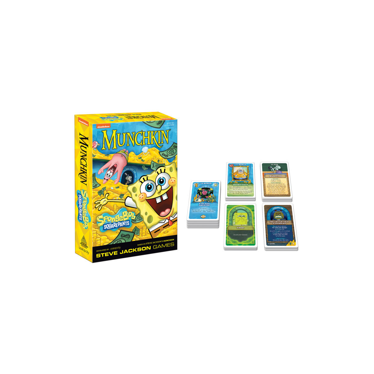Immerse yourself in the whimsical worlds of Bikini Bottom mixed with Steve Jackson Games classic role-playing card game Munchkin! Play as your favorite SpongeBob SquarePants character and equip yourself with Items such as Krusty Krab Hat and Allies like Gary the Snail to defeat monsters and win an underwater race to Level 10!