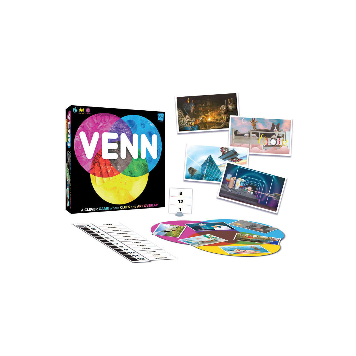Introducing VENN, a clever game where clues and art overlap! Race to find three secret words based on where a Clue Giver arranges unique Art Cards onto color circles. Set a timer or outguess the others to find the similarities, come to the right conclusions, and win! Go head-to-head as teams or work together through cooperative gameplay in this hands-on communication game that mixes friendly competition and fun. For 2+ players, ages 10+. Contents: 6 VENN Circles, 100 Double-sided Art Cards, 50 Double-sided Word Cards, 100 Number Cards, 1 Scoreboard, 2 Team Scoring Markers, 2 Number Card Holders, and Rules.